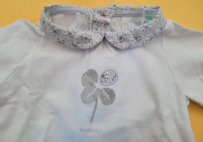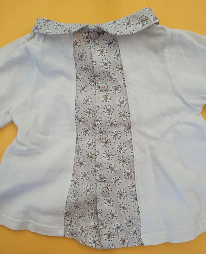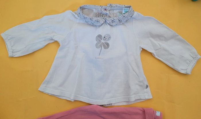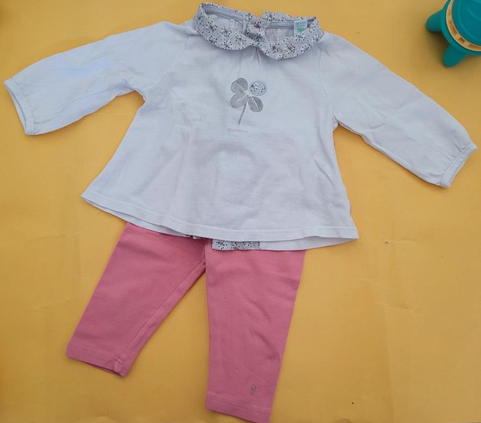 Petite tenue taille 6 mois Obaibi (68cm). IDEALE pour le printemps. * Haut style blouse à manches longues. Blanche et grise. Motifs fleuris. Col Claudine. S'ouvre entièrement par boutons à l'arrière. Très bon état. * legging rose stretch en très bon état. Élastique aussi. #T6_9mois_baptlily