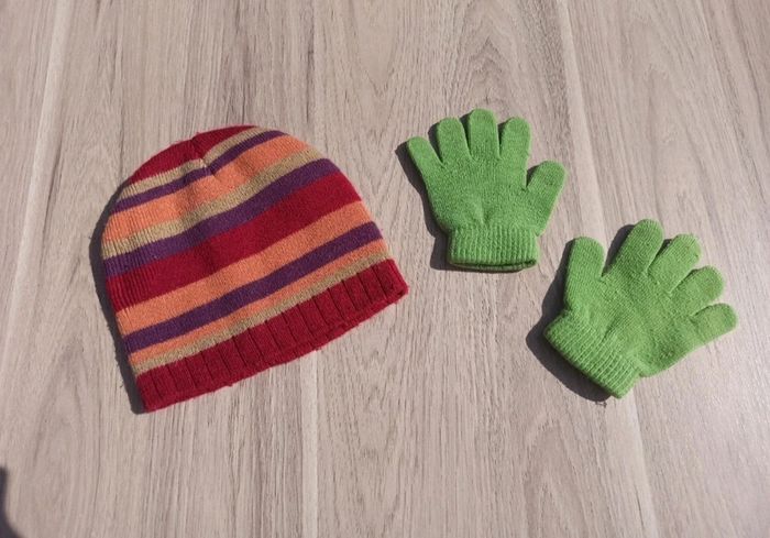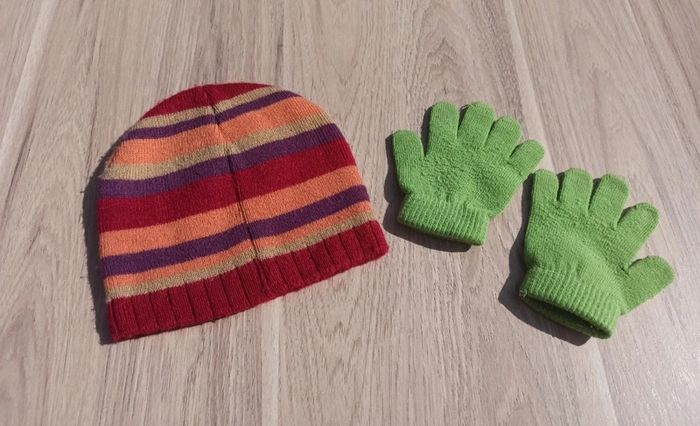 Bonnet Rayé Bordeaux, Orange, Rouge & Taupe + Gants Verts Unis – Taille Unique - photo numéro 1