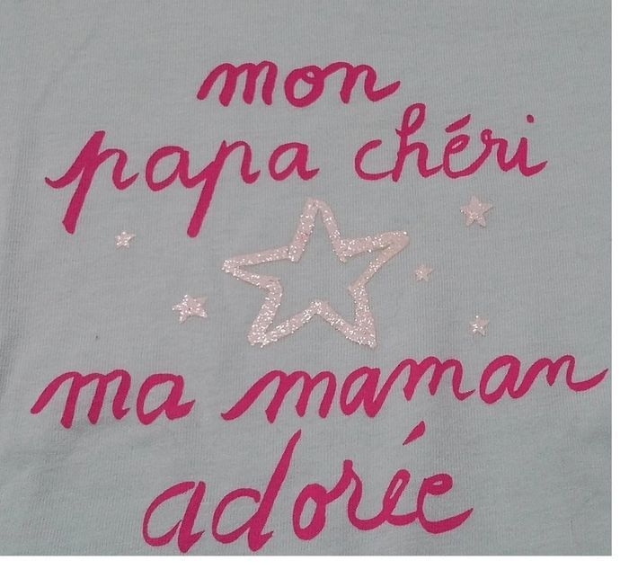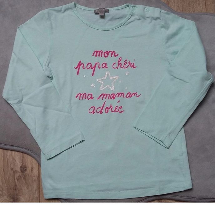 tee-shirt manches longues grain de blé inscription : mon papa chéri, ma maman adorée" 4 ans couleur menthe/rose fuchsia en très bon état PRIX DE VENTE FERME, MERCI Pour visualiser tous ce que je possède en 4 ans : #ambre626904ans
