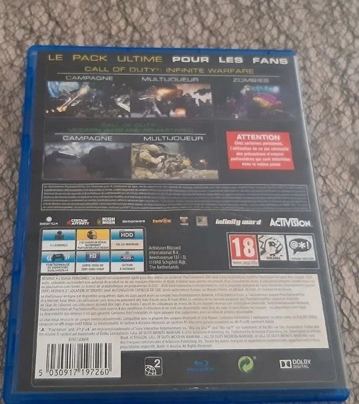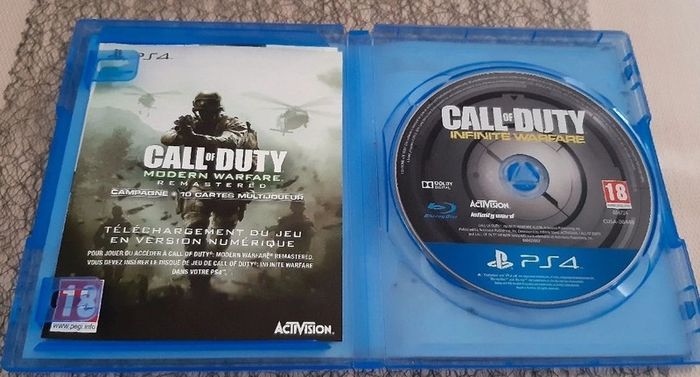 Jeu PS4 Call of duty infinite warfare Le code pour le jeu second en version numérique à déjà été utilisé Le jeu est en parfait état (aucune rayure) En revanche, la pochette à été tachée par du café. (Le jeu n'était pas dans la boite lorsque s'est arrivé....) PRIX DE VENTE DE 12 EUROS FERME