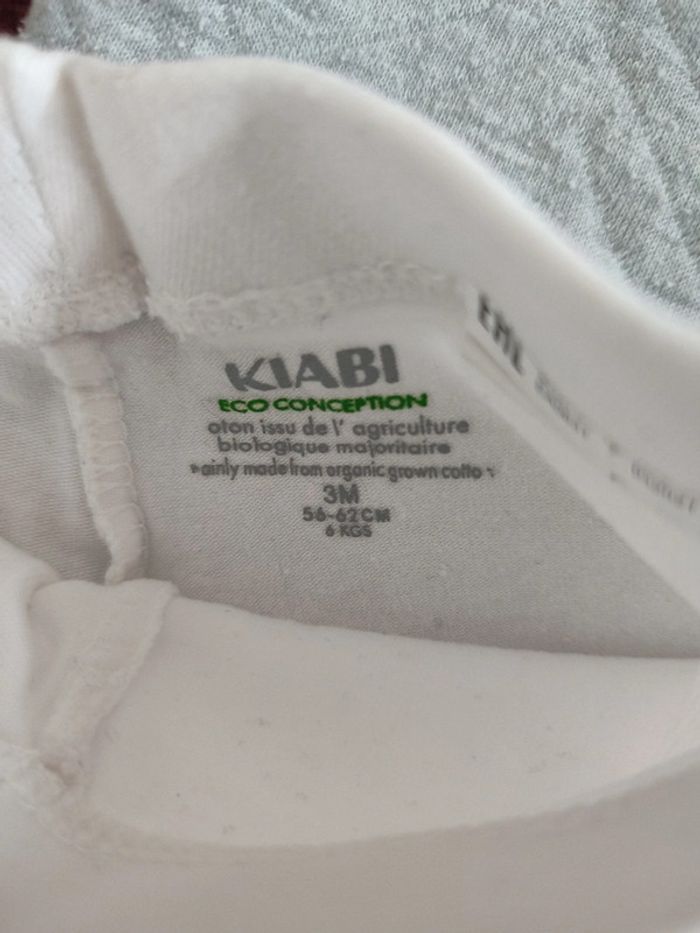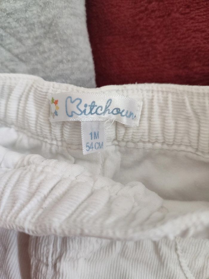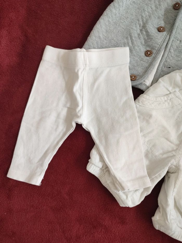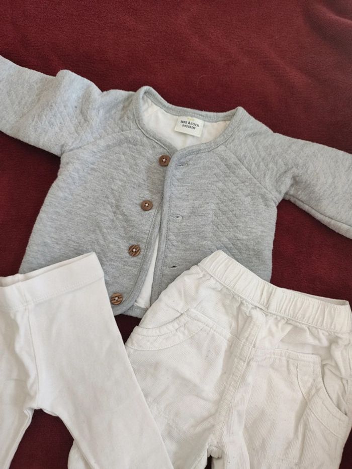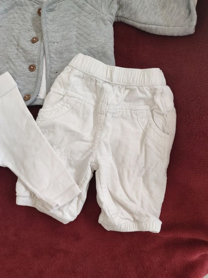 Ténue 3 pièces. T 1 mois. 1 gilet gris doublé, 1 legging blanc et 1 pantalon côtelée doublé blanc.