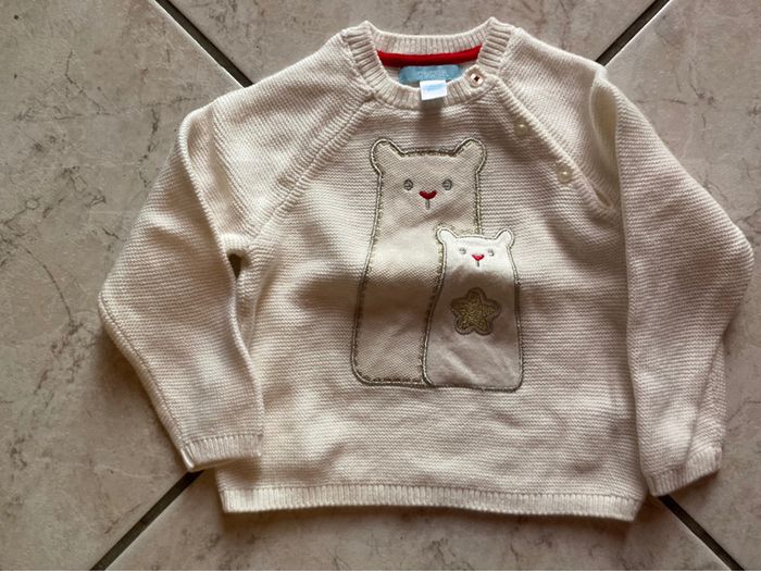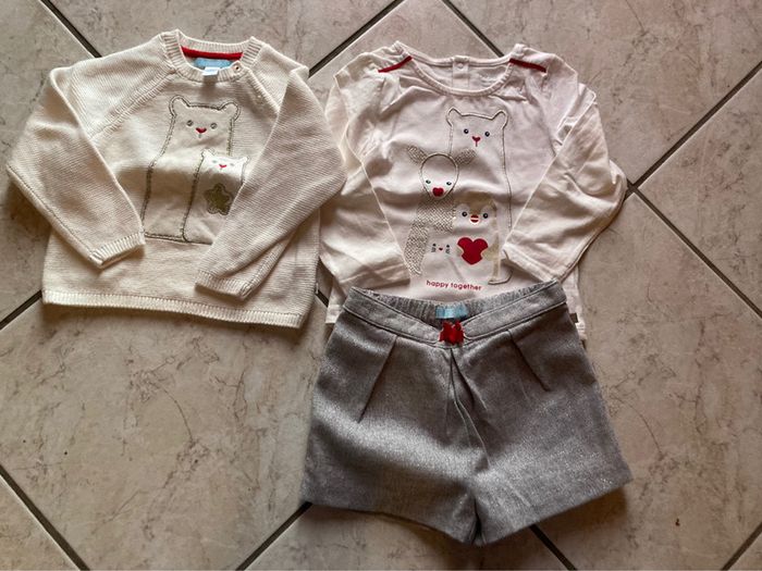 Très bel ensemble Okaidi neuf juste lavé oublié dans l’armoire. Il se compose d’un pull écru avec boutons devant pour facilité l’habillage, un t-shirt manches longues avec trois pressions dans le dos et un short avec fils argentés et avec boutons à l’intérieur pour ajuster à la taille. #alexanamar_dixhuitmoisfille