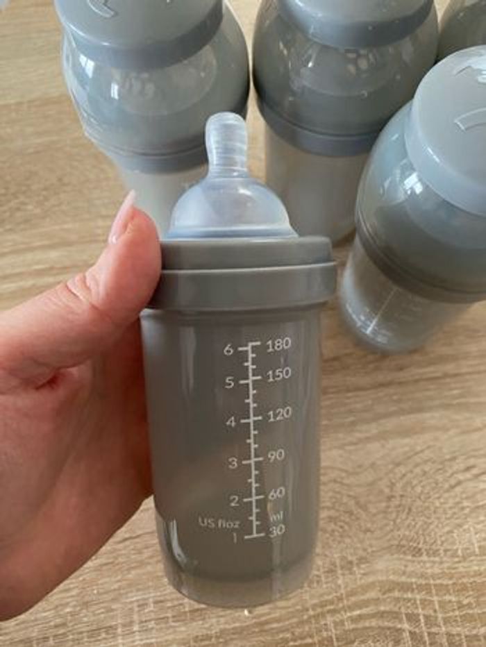Vend lot de 5 biberons twistshake, état neuf, ne convient pas à ma fille. Juste un seul d’utilisé, les autres ont juste été lavés. juste une tétine d’utilisée (un peu orangée à cause de la carotte)