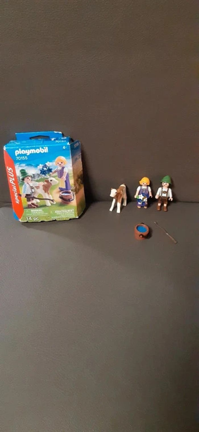 JE N'ACCEPTE PAS D'OFFRE MERCI Playmobil special plus - enfants avec veau No 70155 14 pièces 2 personnages, 1 veau, 1 bouquet, 1 bâton, 1 seau et un chapeau Vendu complet Le jouet est dans un état neuf La boite est par contre abîmée en raison du stockage