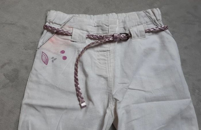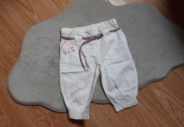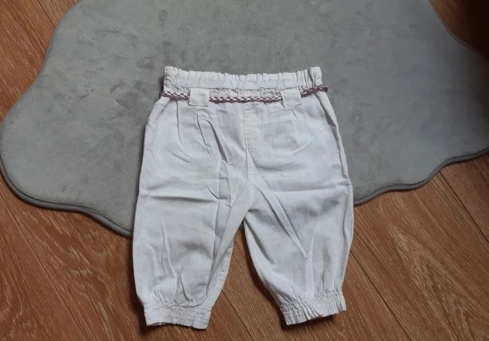 pantacourt en lin (non doublé donc fin) avec bas de jambe elastiqué ceinture assorti taille resserable à la ceinture (par élastique) marque gémo blanc 36 mois en très bon état prix de vente ferme, merci Pour visualiser tous ce que je possède en 3 ans : #ambre626903ans