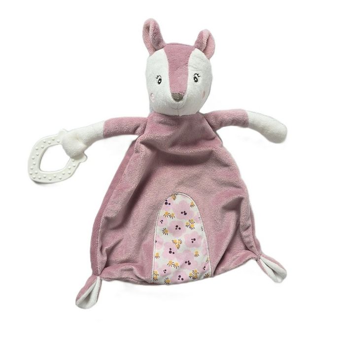 Doudou plat Biche rose blanc fleurs anneau dentition TOPOMINI