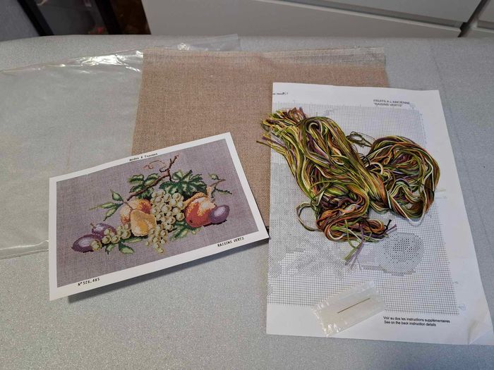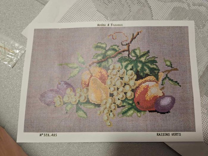 Joli kit de broderie point de croix housse de coussin, marque Modes & Travaux, Création Margot de Paris, les fruits à l'ancienne "raisins verts", comprenant une toile écrue foncée pour coussin format 46 x 46 cm, les fils à broder de marque DMC 100 % coton, l'aiguille ainsi que le diagramme avec explications.