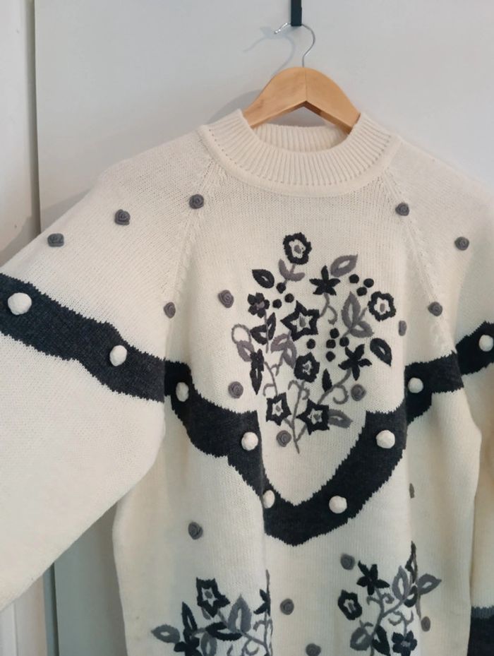 Pull vintage col montant, broderies et pompons - photo numéro 9