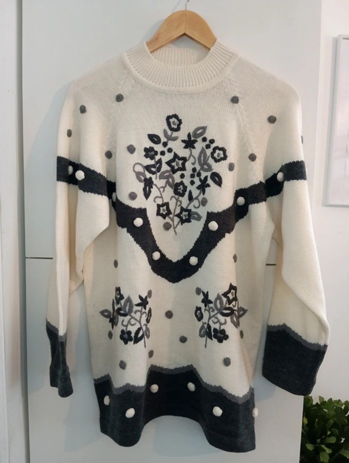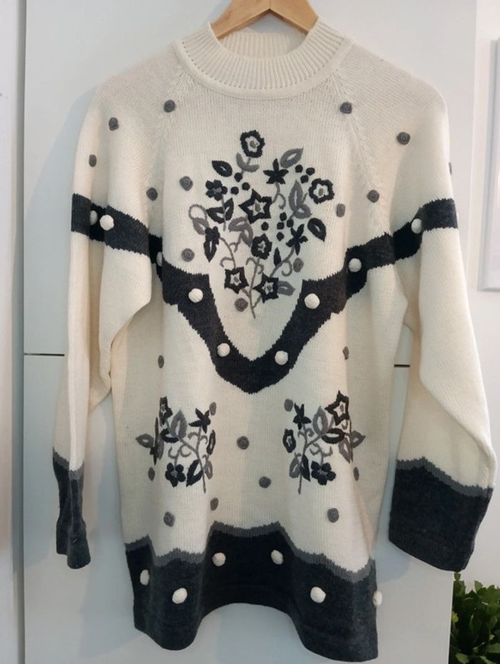 Pull vintage col montant, broderies et pompons - photo numéro 1