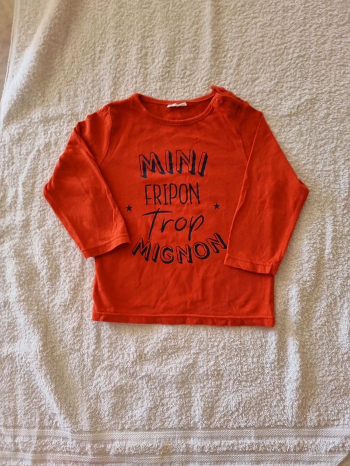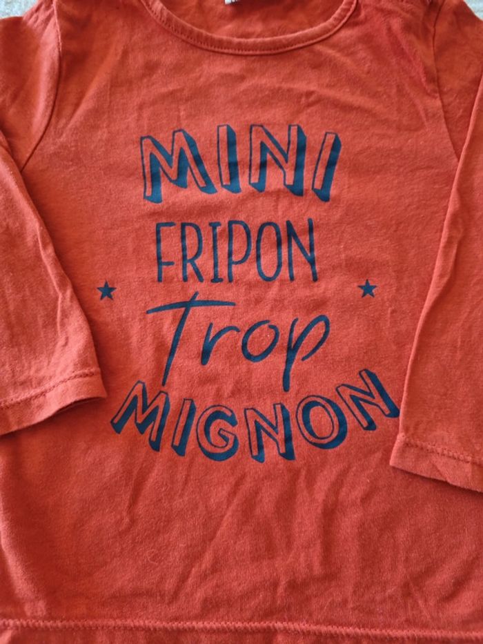Tee-shirt manches longues rouge orangé écriture marine #totote1986_tailles12_18mois