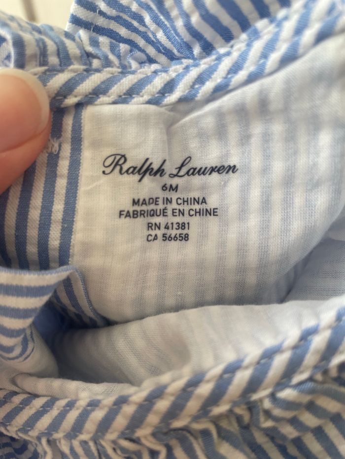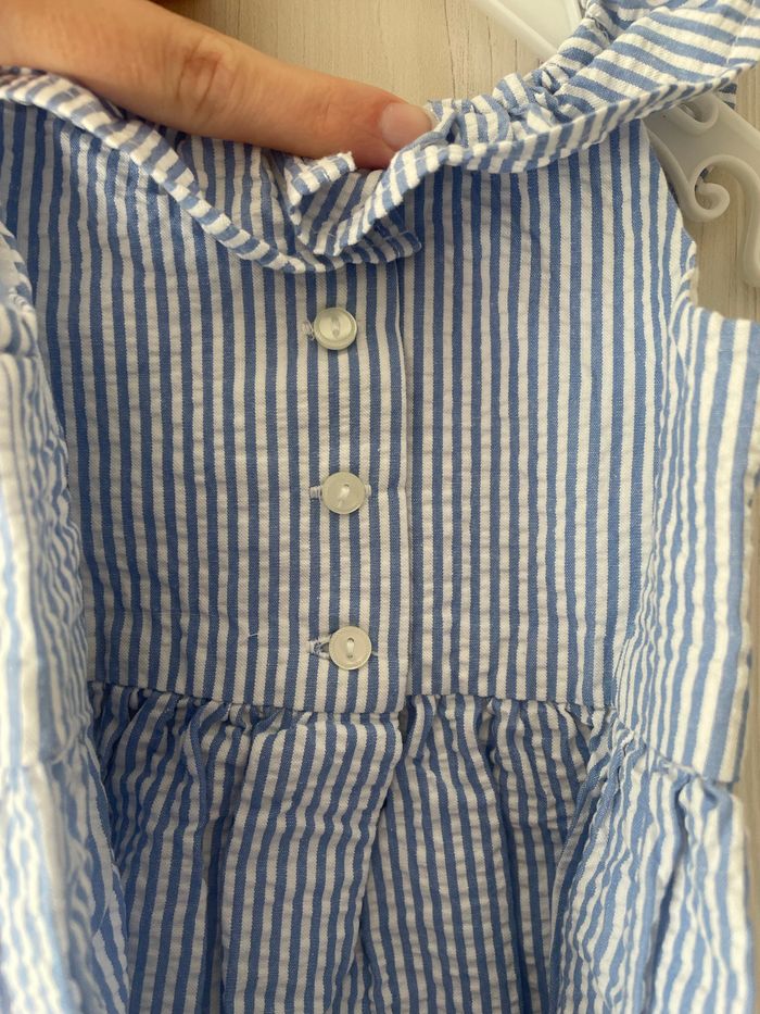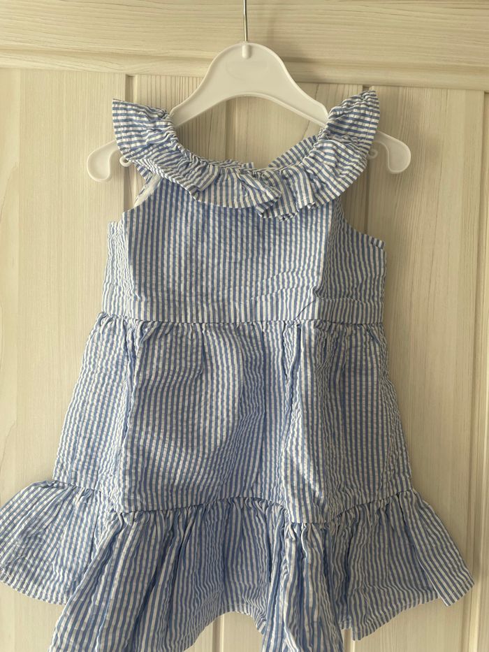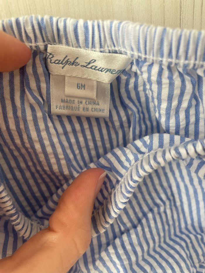 Très belle robe été sans manche Ralph Lauren, blanche et bleu clair à rayures, col volanté, bloumer assorti. La robe se ferme au dos par boutons ordinaires. Première main. Portée une seule fois, excellent état, comme neuve. Taille 6 mois Maison non fumeur et sans animaux