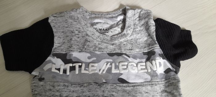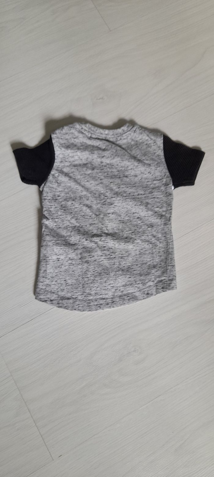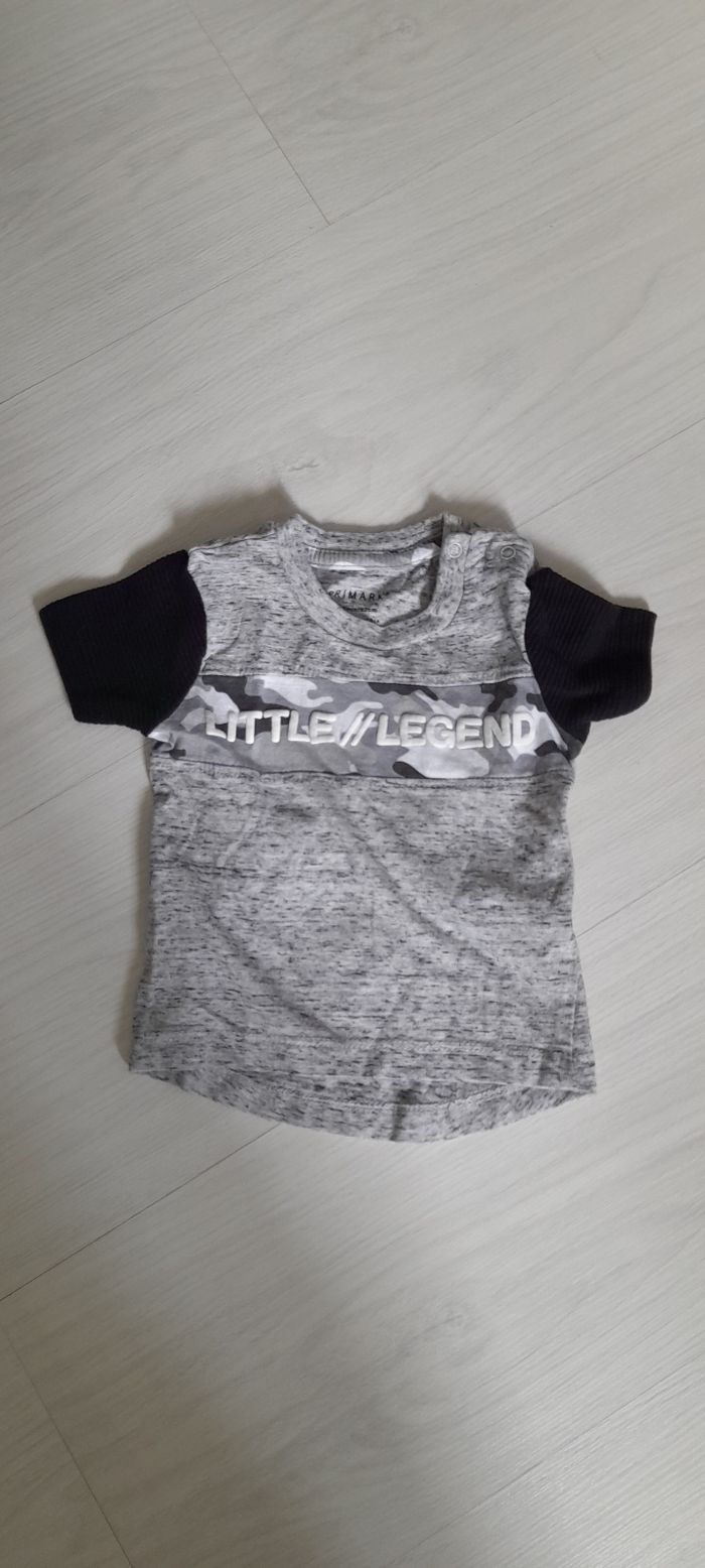 Tee-shir T 3 mois Marque PRIMARK Couleur gris et noir Inscription sur devant Attache pressions sur épaule gauche Très très bon état