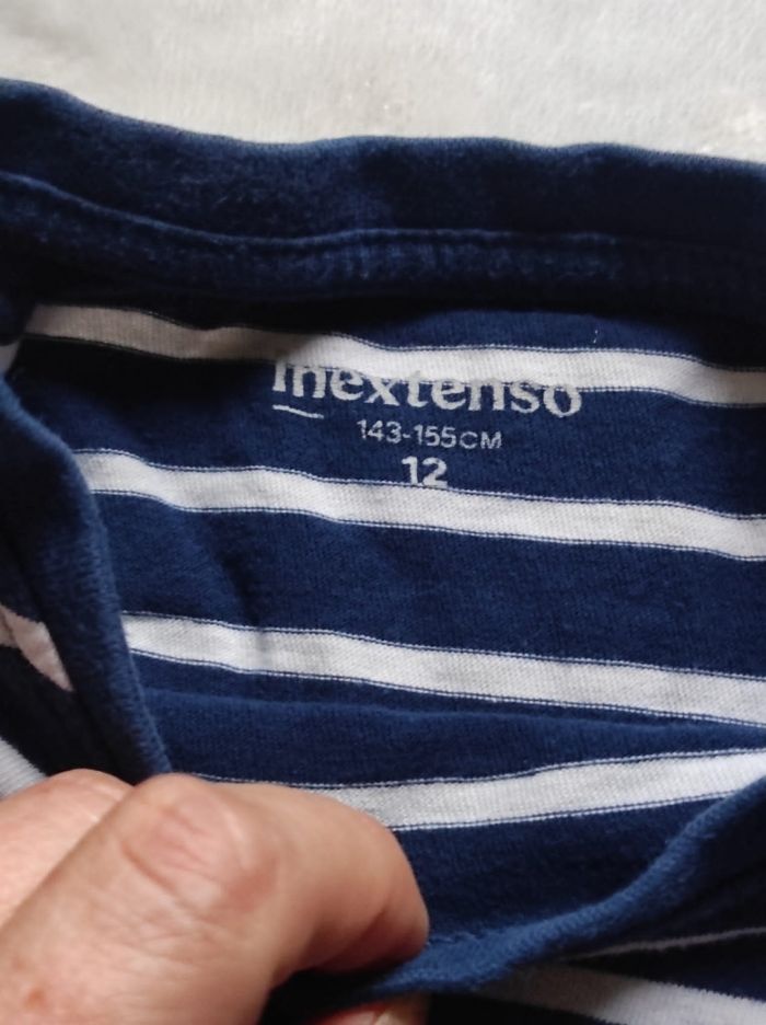 pull à col rond et manches longues avec rayures blanches sur fond bleu marine. De la marque in extenso en taille 12ans. En parfait état car peu porter.