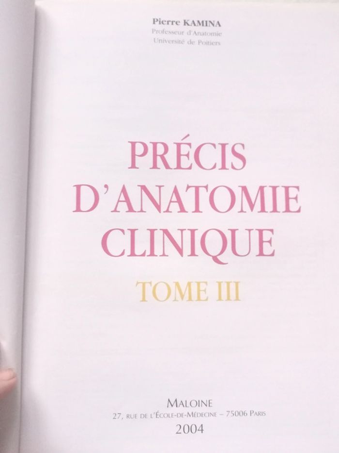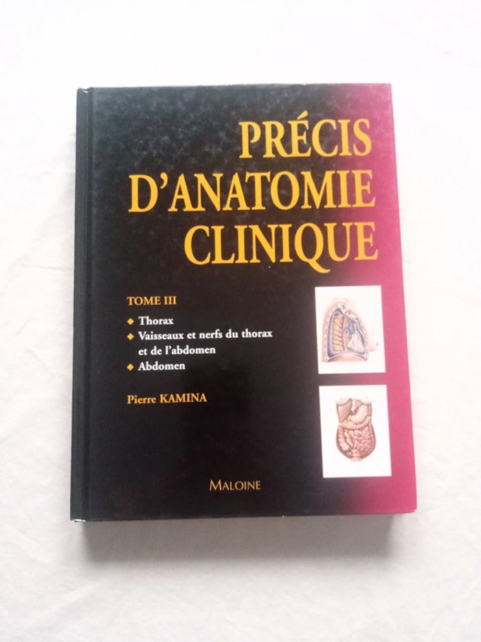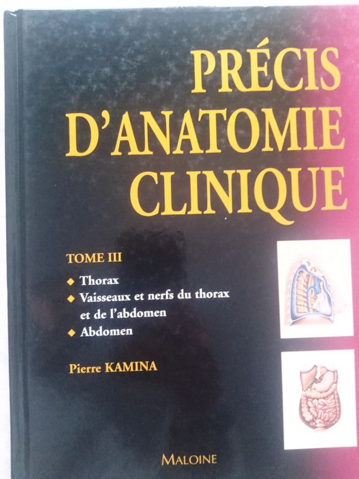 Précis d'anatomie clinique Tome III : Thorax - Vaisseaux et Nerfs du Thorax et de l'abdomen - Abdomen Pierre Kamina Éditions Maloine 2004 Couverture Rigide 347 pages Médecine J'ai également le tome IV (Organes urinaires, pelvis, organes génitaux, périnée, coupes du tronc) en vente dans mon dressing. #lily2905loisirsjeuxjouetslivresBD #lily2905jeuxjouetslivresbd