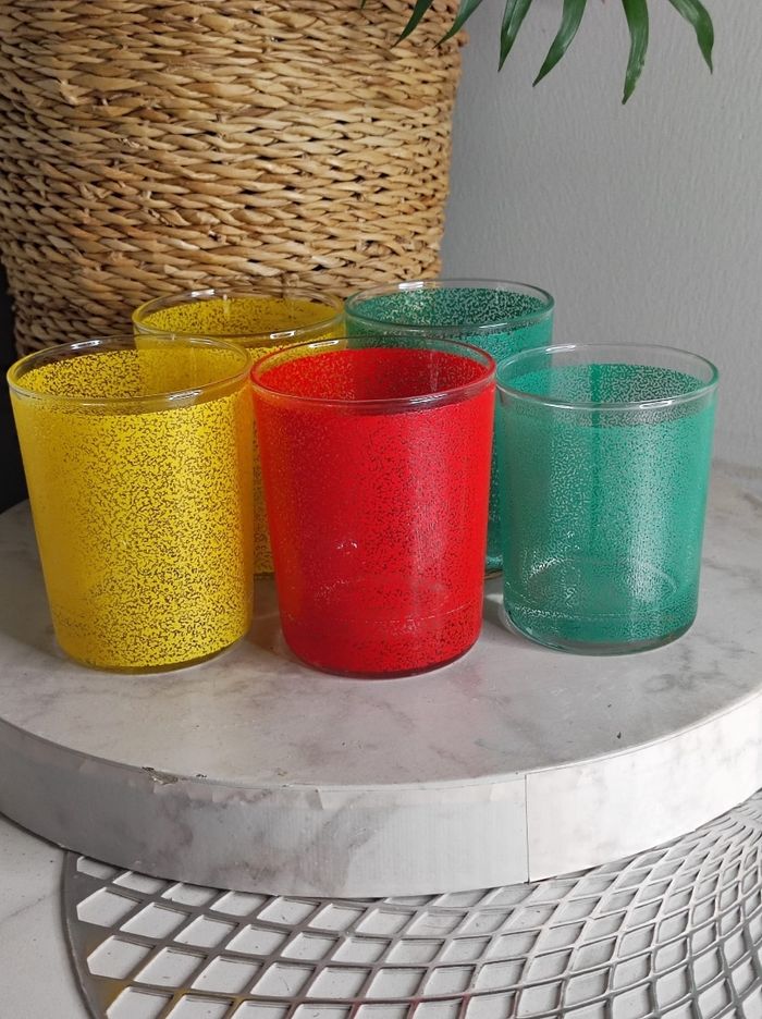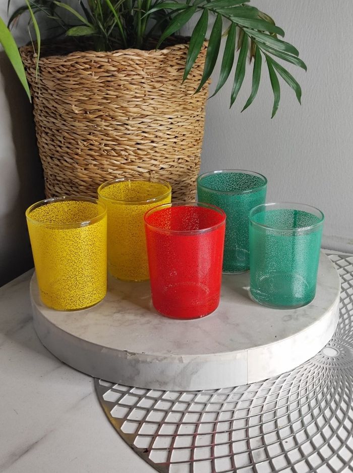 Magnifique ensemble de 5 verres à eau vert, jaune et rouge, 1970. Un vert est légèrement petit comparer aux autres. En très bon état, de rares traces du temps. Dimensions D6x H8