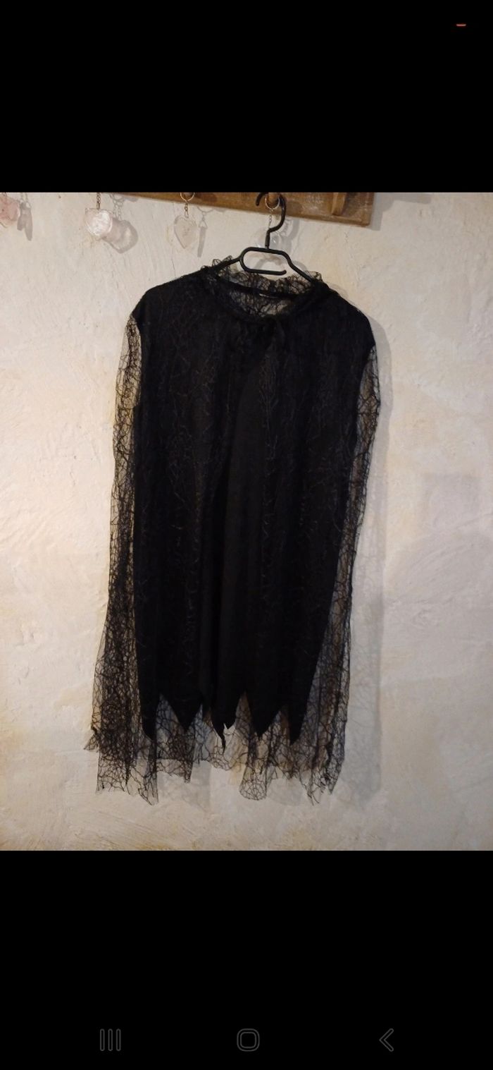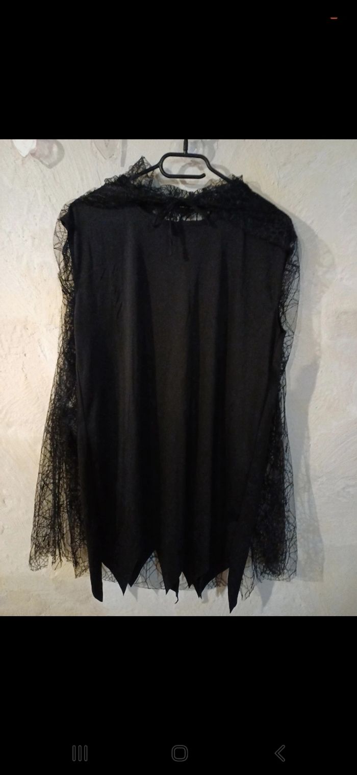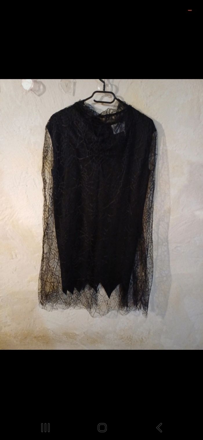 Déguisement d araignée comportant une petite robe noire sans manches et un poncho par dessus noué au niveau du col . Neuf