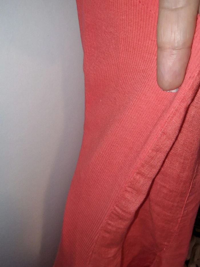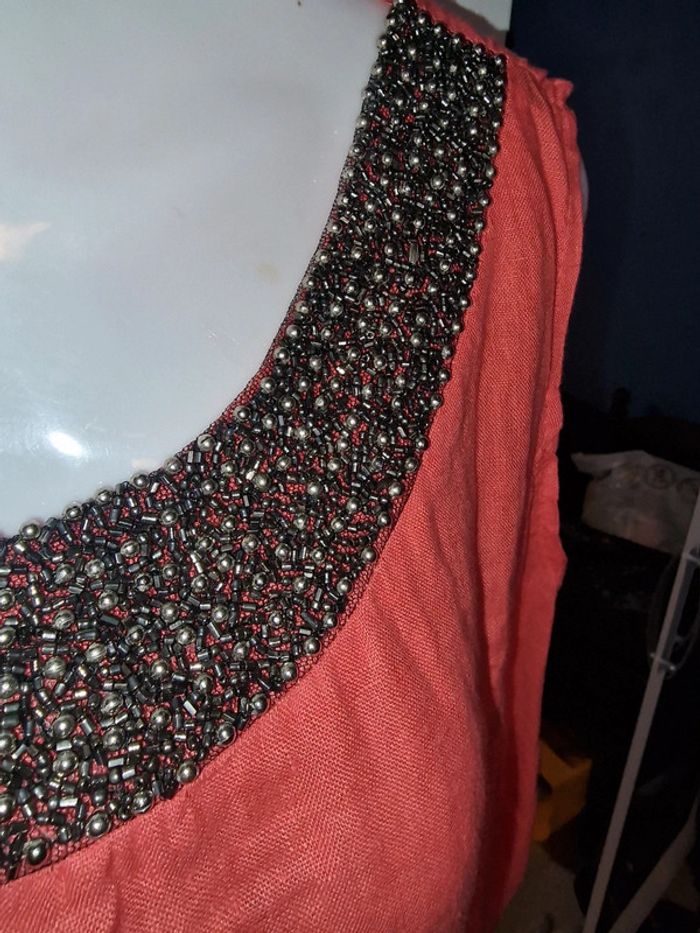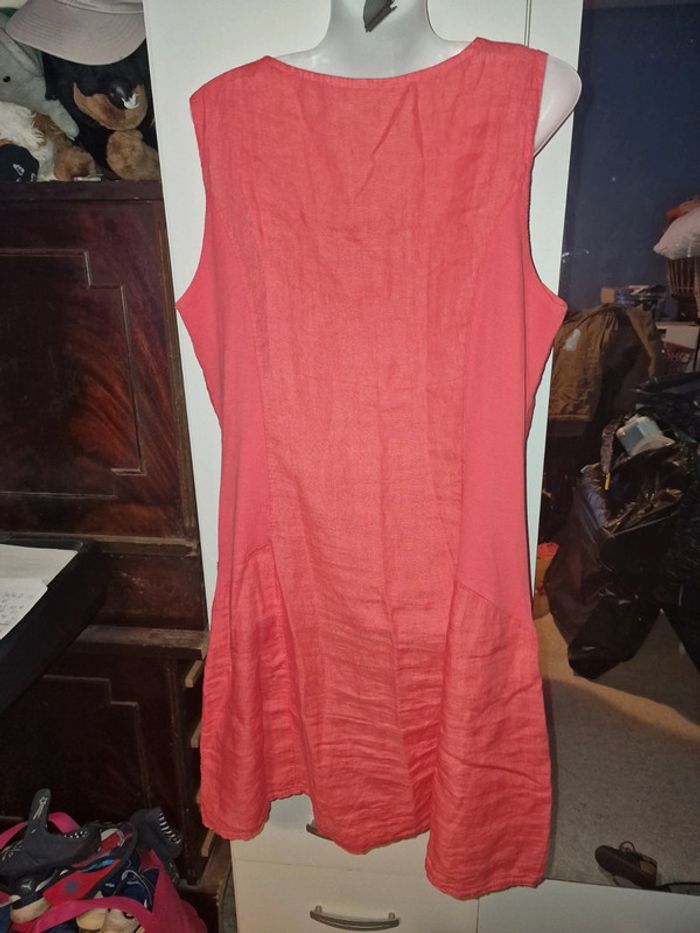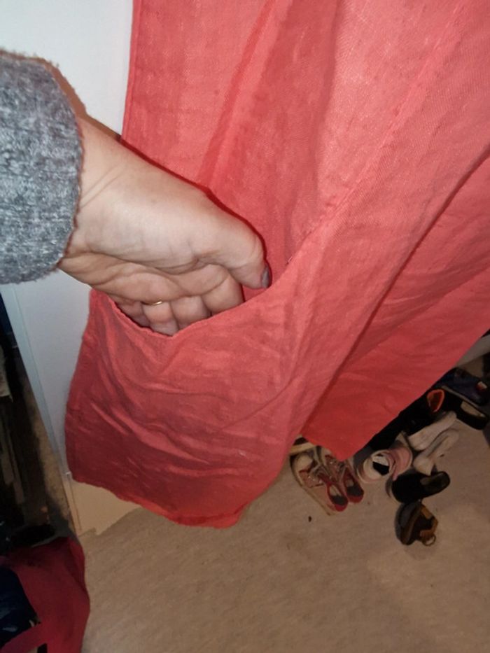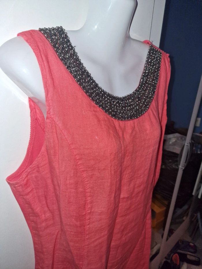 Jolie robe mi-longue en lin avec une partie tissu stretch de chaque côté pour plus de confort, et une très belle encolure en perles métalliques 2 poches de chaque côté à hauteur de taille Taille aisselles de 50cms à plat à 65 en tirant Hauteur 93cms Je n'ai pas remarqué d'anomalie