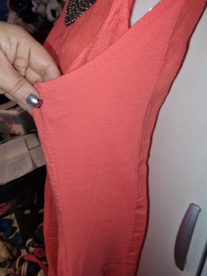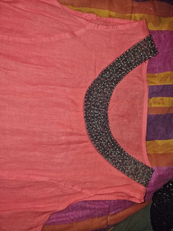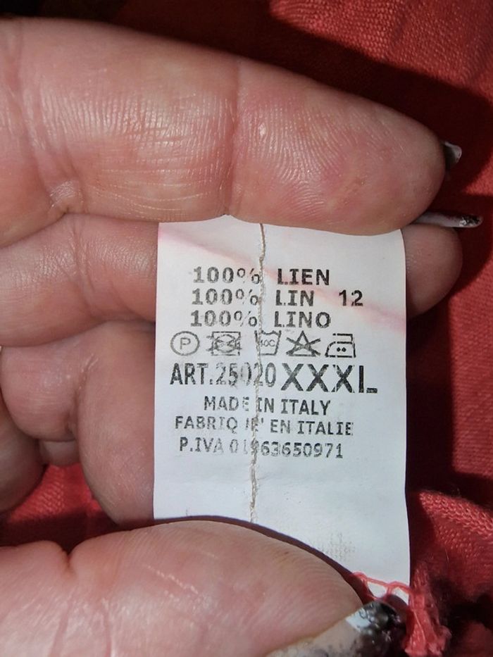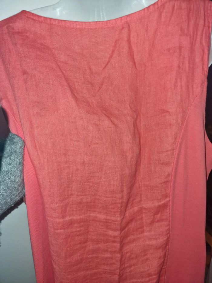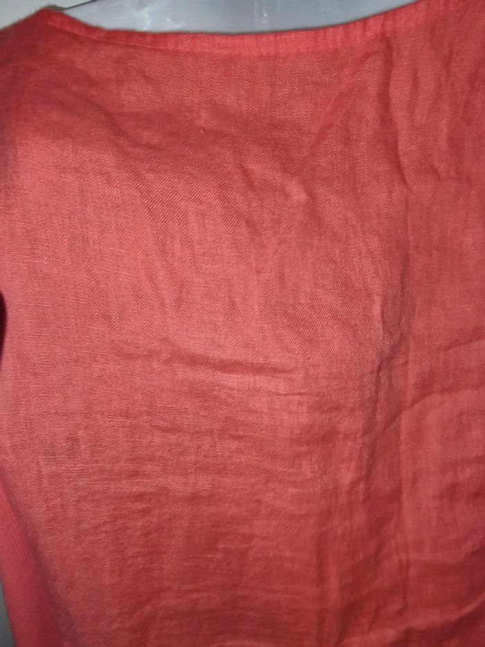 Jolie robe mi-longue en lin avec une partie tissu stretch de chaque côté pour plus de confort, et une très belle encolure en perles métalliques 2 poches de chaque côté à hauteur de taille Taille aisselles de 50cms à plat à 65 en tirant Hauteur 93cms Je n'ai pas remarqué d'anomalie