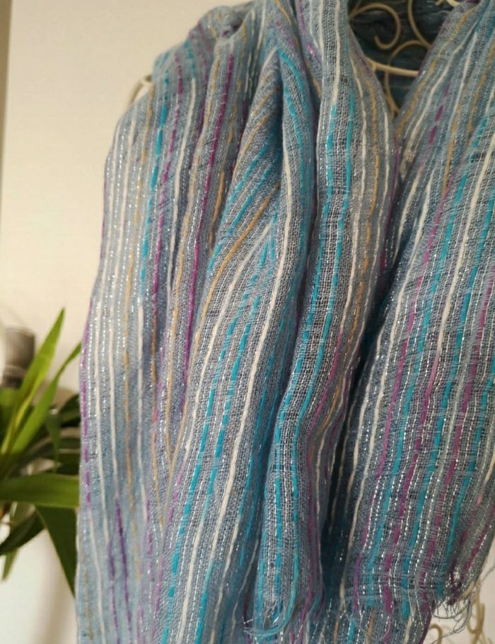 Écharpe bleu ciel avec filament violet bleu jaune argenté.