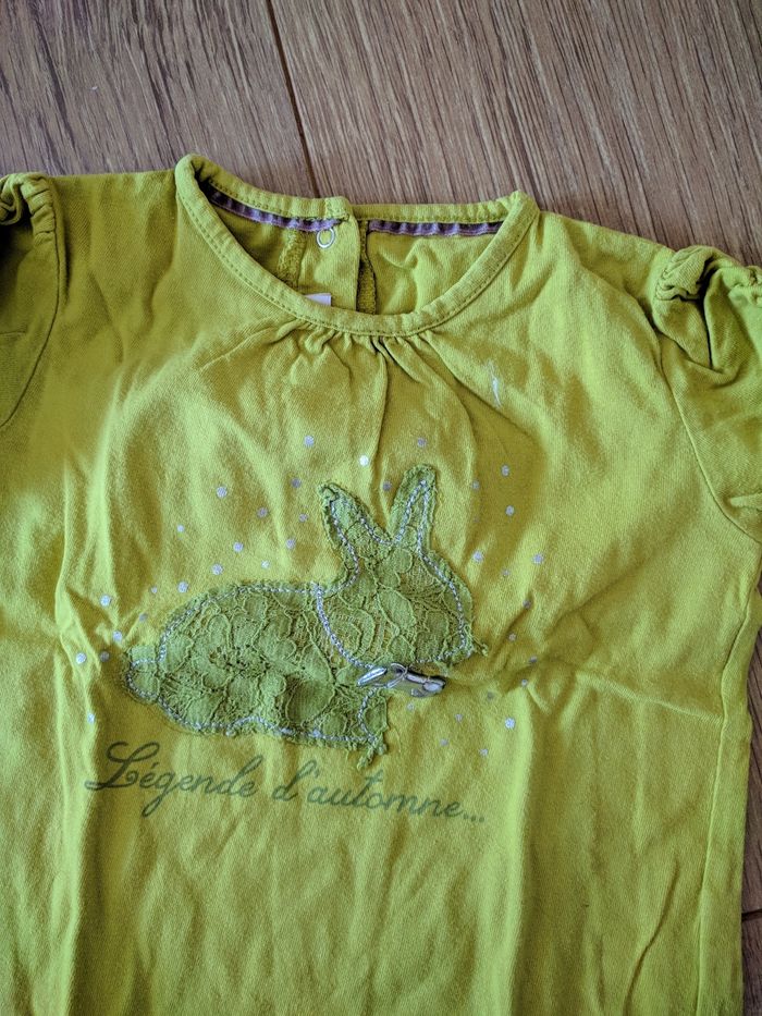 T-shirt manches longues vert avec un lapin et se ferme par boutons pressions dans le dos