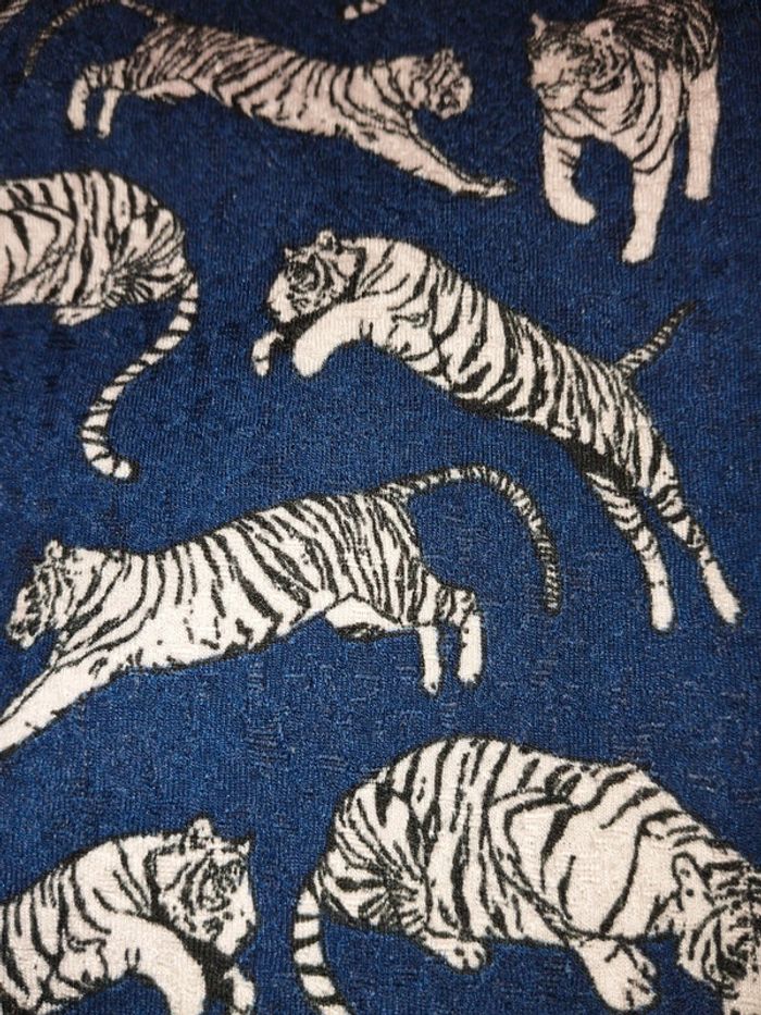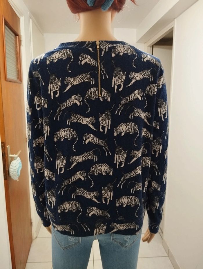 ℹ️ Pull de couleur marine avec des dessins de tigres blanc. Il y a des décorations sur le tissu. Il se ferme dans le cou avec une fermeture éclair. Coupe ample et Matière légèrement extensible. 🧵 98% polyester 2% élasthanne 📏 Largeur épaules: 39cm Aisselle à aisselle: 54cm Largeur taille: 53cm Longueur totale: 58cm V