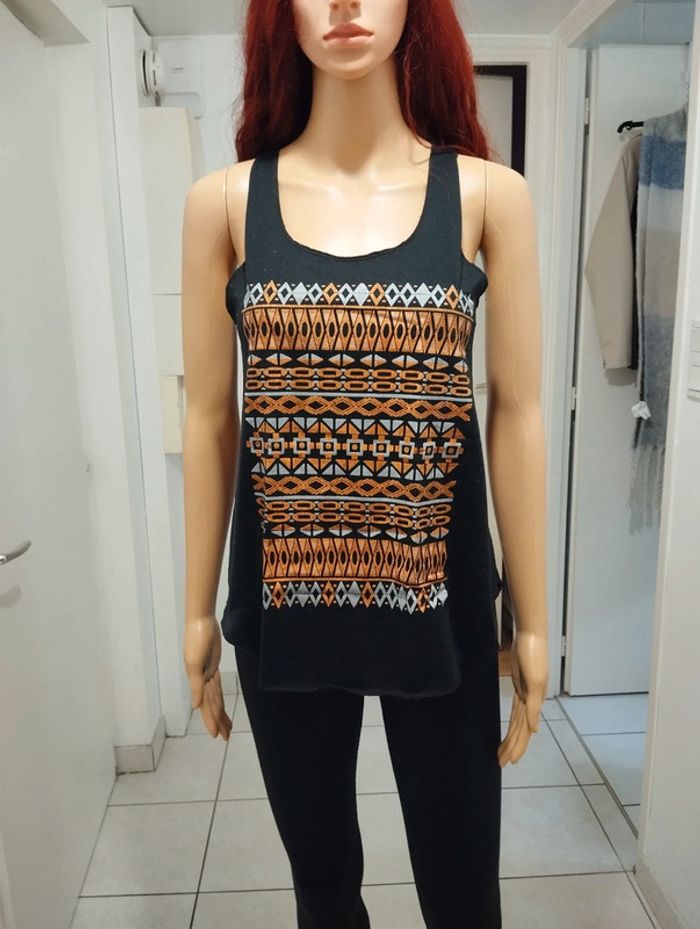 ℹ️ Débardeur de couleur noir avec des motifs orange et gris sur le devant. Matière douce et agréable. Dos nageur. 🧵 Étiquette de composition effacée. 📏 Aisselle à aisselle: 41cm Largeur taille: 44cm Longueur totale: 63cm U