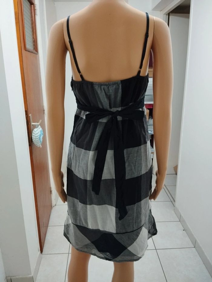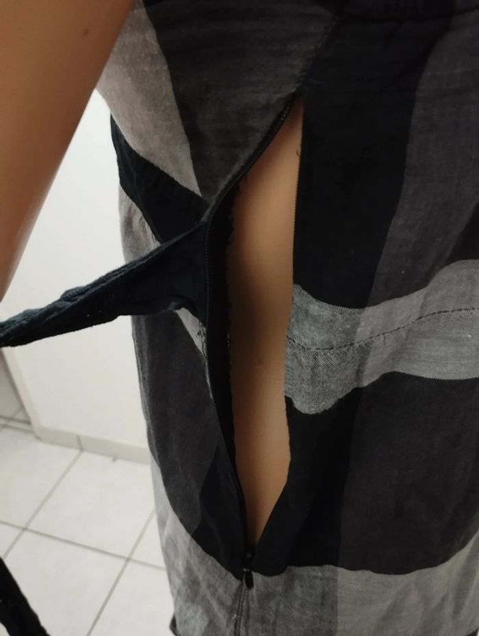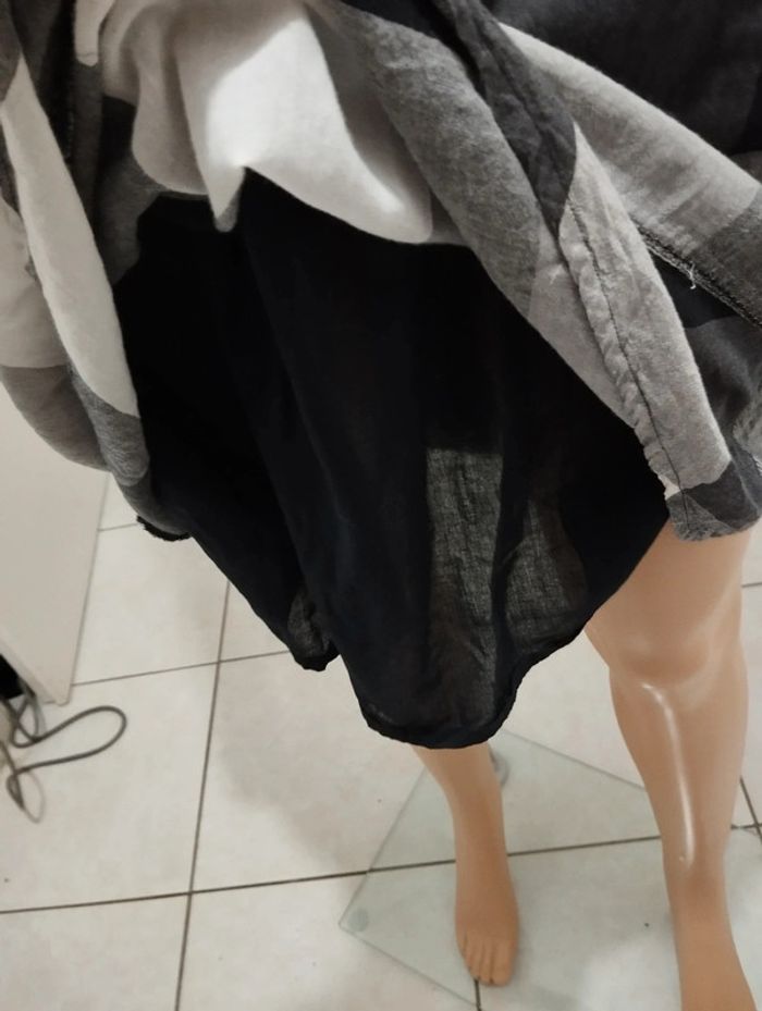 ℹ️ Robe de couleur noire avec différents gris. Les bretelles sont réglables et le haut du dos à un élastique. Il y a une fermeture éclair sur le côté. Possibilité de resserrer la taille grâce aux lanière à la taille. Il y a un jupon sous la robe. 🧵 100% coton 📏 Aisselle à aisselle: 35-43cm Largeur taille: 39cm Longueur totale: 90cm U