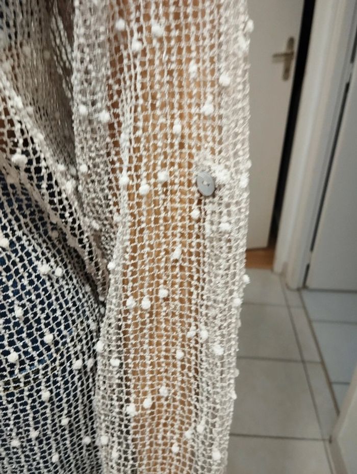 ℹ️ Tunique faite en mailles ajourées de couleur beige et crème. Il y a des tout petits pompons un peu partout et quelques sequins. Le bas se fi ot pr une bande de tule brodée. Dans le dos il y a un noeud avec une partie en tulle. Les manches peuvent être retroussées. Coupe ample. 🧵 Pas d'étiquette de composition. 📏 Largeur épaules: 48cm Aisselle à aisselle: 62cm Largeur taille: 61cm Longueur totale: 69cm U