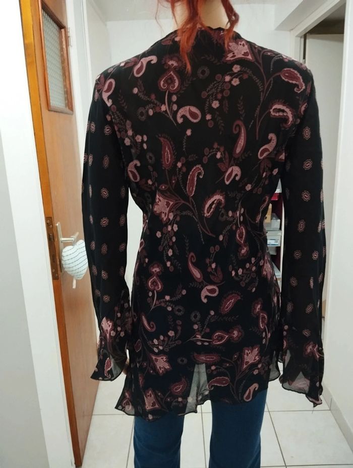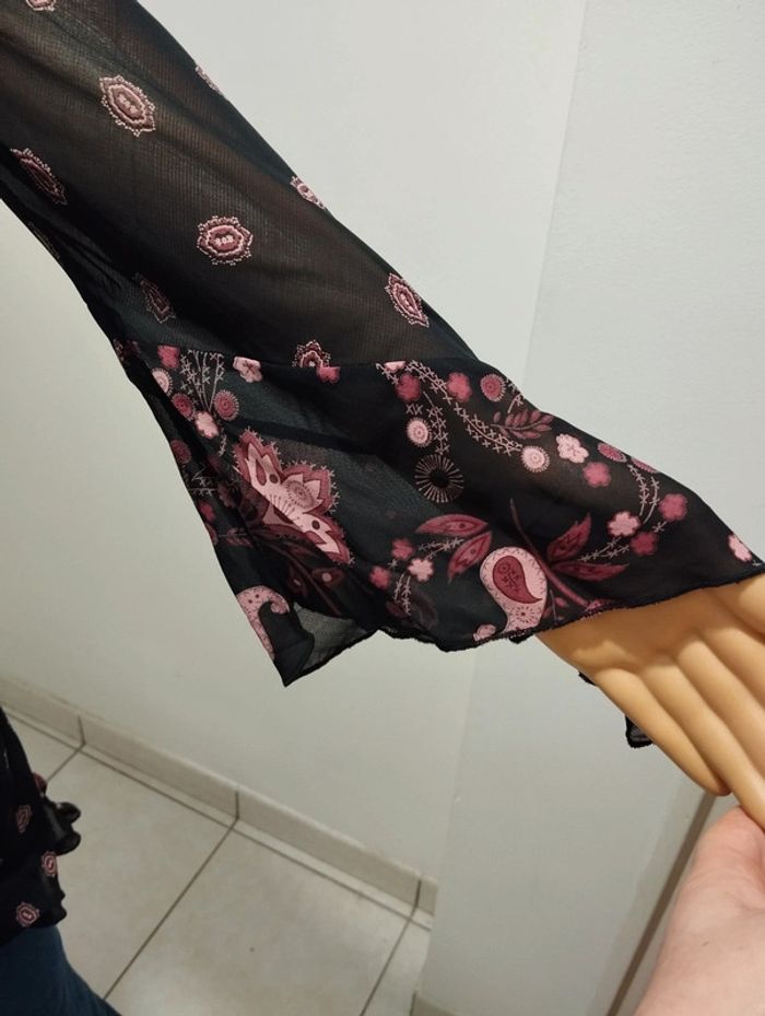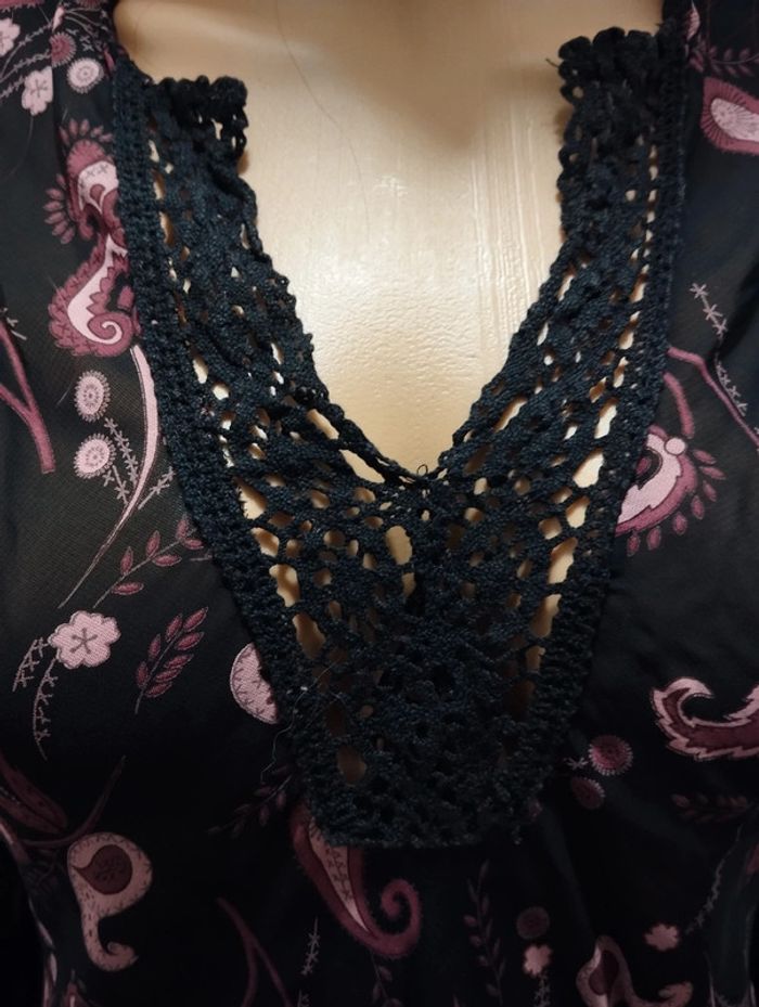 ℹ️ Magnifique tunique de couleur noire avec des décors de feuilles dans différents tons rose. Comme neuve, portée une seule fois. Le décolleté est fait en dentelle. Coupe cintrée avec une finition en oblique, pareil pour les manches. Tissu très léger, fluide et un peu transparent. Très agréable à porter. 🧵 100% viscose 📏 Largeur épaules: 44cm Aisselle à aisselle: 55cm Largeur taille: 47cm Longueur totale: 87cm U