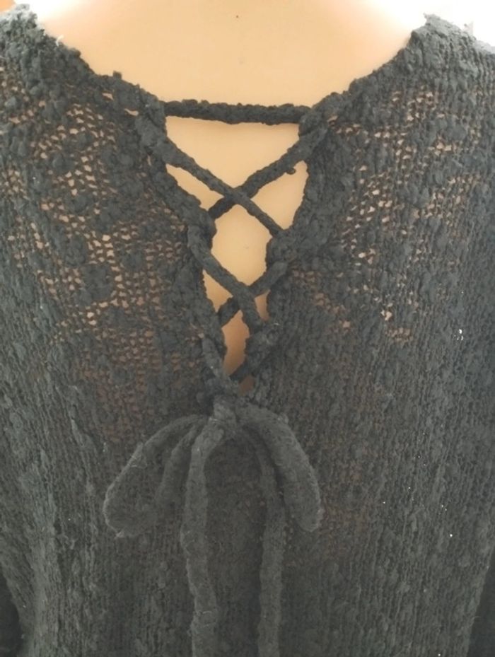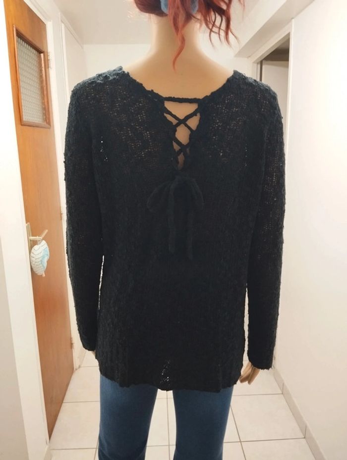 ℹ️ Pull de couleur noir fait de mailles ajourées. Il y a des petits poins noir en relief. Il y a un laçage dans le haut du dos. La matière n'est pas extensible mais elle peut s'étirer. 🧵 Pas d'étiquette de composition. 📏 Largeur épaules: 42cm Aisselle à aisselle: 50cm Largeur taille: 49cm Longueur totale: 67cm U