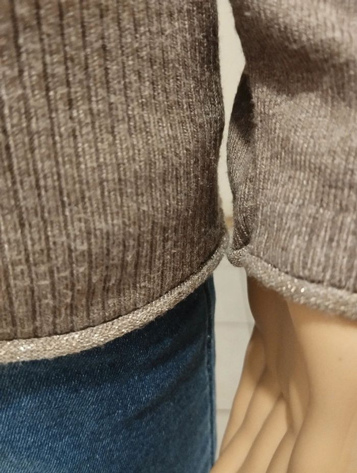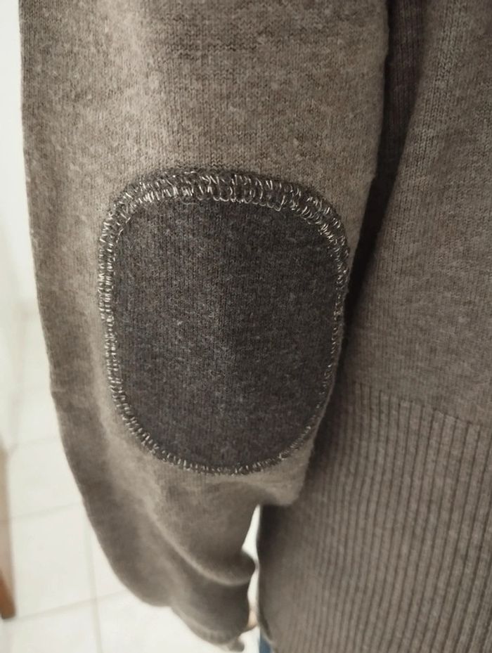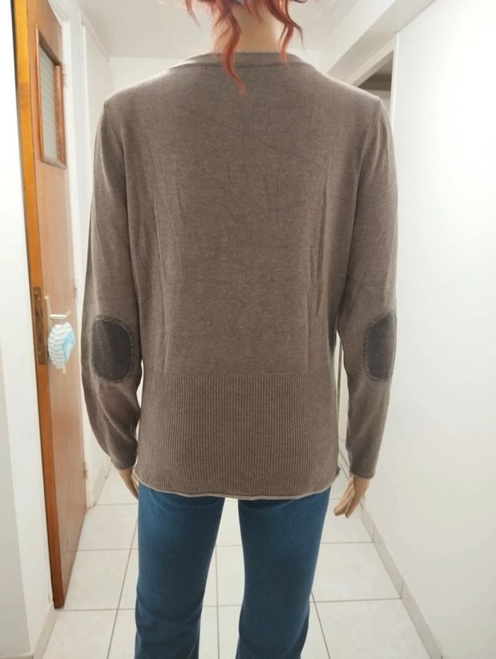 ℹ️ Pull de couleur beige. Il possède des coudières de couleur grises. Il y a un liseré doré à chaque extrémités. Le décolleté se fini par des boutons décoratifs. Matière légère et extensible. Coupe près du corps. 🧵 76% viscose 24% nylon 📏 Largeur épaules: 40cm Aisselle à aisselle: 49cm Largeur taille: 45cm Longueur totale: 59cm Mam