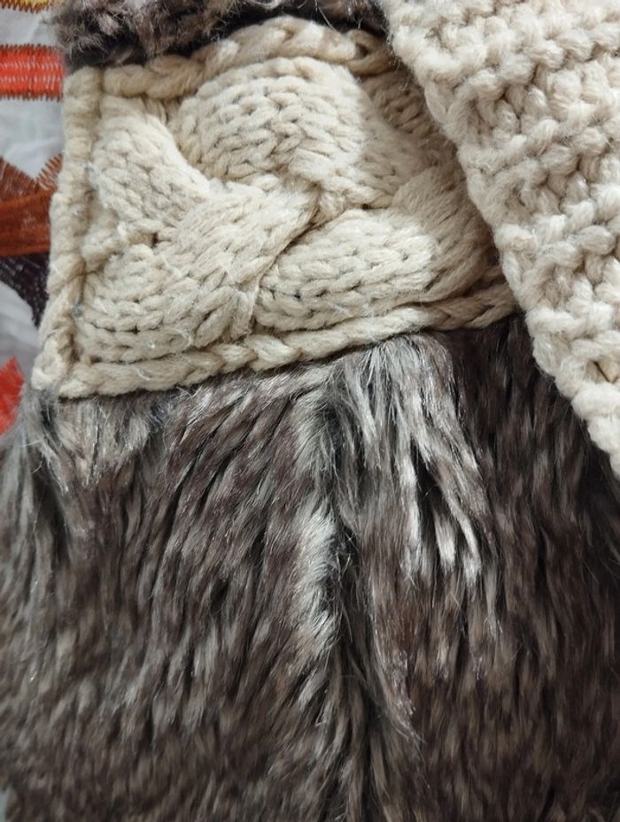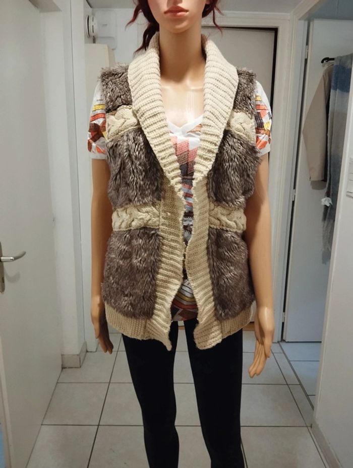 ℹ️ Gilet de couleur beige avec des parties en poil synthétique. L'intérieur est doublé sur le devant. L'ensemble est plutôt chaud et les poils doux. 🧵 Extérieur: 100% acrylique Fourrure: 58% acrylique 42% polyester Doublure: 100% polyester 📏 Aisselle à aisselle: 48cm Largeur taille: 42cm Longueur totale: 66cm U