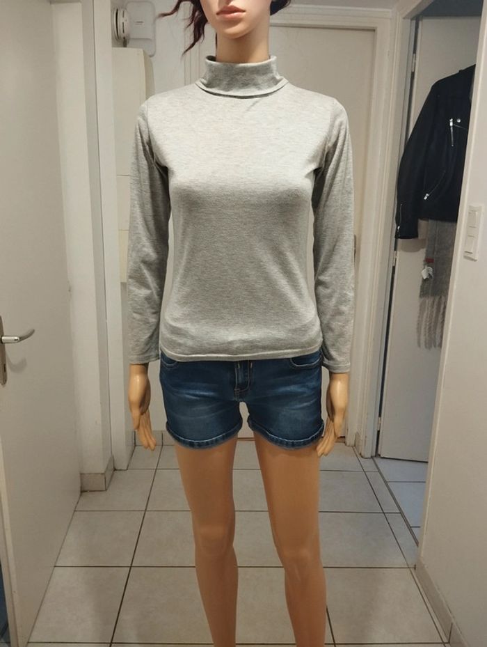 ℹ️ Sous pull de couleur gris clair. Il possède un col roulé. Taille unique mais correspond à un 36/38. Matiere plutôt fine mais tient un peu chaud. 🧵 95% viscose 5% élasthanne 📏 Largeur épaules: 37cm Aisselle à aisselle: 42cm Largeur taille: 38cm Longueur totale: 55cm R2