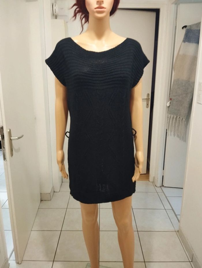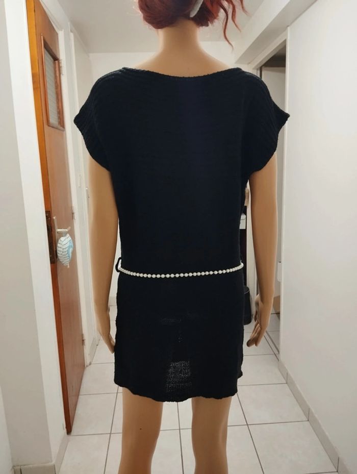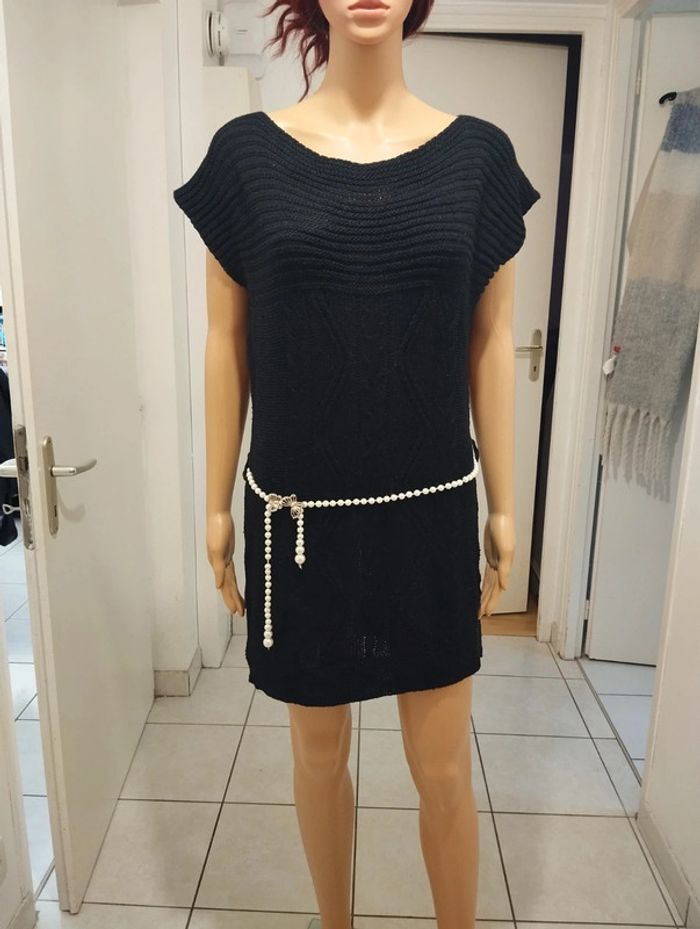 ℹ️ Robe de couleur noire en maille. Le col est droit et elle arrive à peu près à mi cuisses. Il y a des passants pour mettre une ceinture (non fournie). 🧵 100% acrylique 📏 Largeur épaules: 40cm Aisselle à aisselle: 53cm Largeur taille: 44cm Longueur totale: 84cm Jc