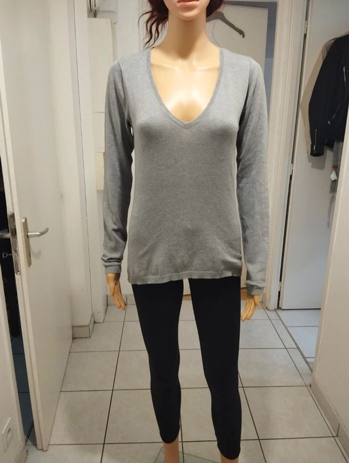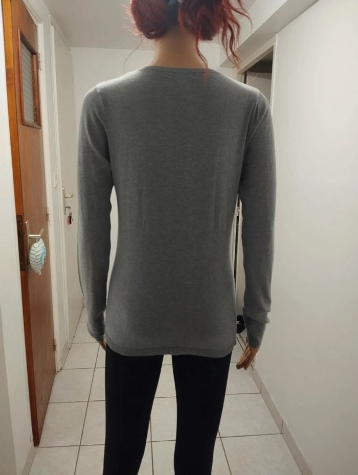 ℹ️ Pull de couleur gris clair. Matière extensible, légère, douce et légèrement chaude. Se porte près du corps. 🧵 Pas d'étiquette de composition. 📏 Largeur épaules: 38cm Aisselle à aisselle: 45cm Largeur taille: 42cm Longueur totale: 60cm T1