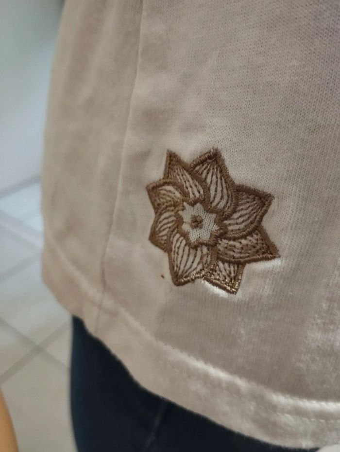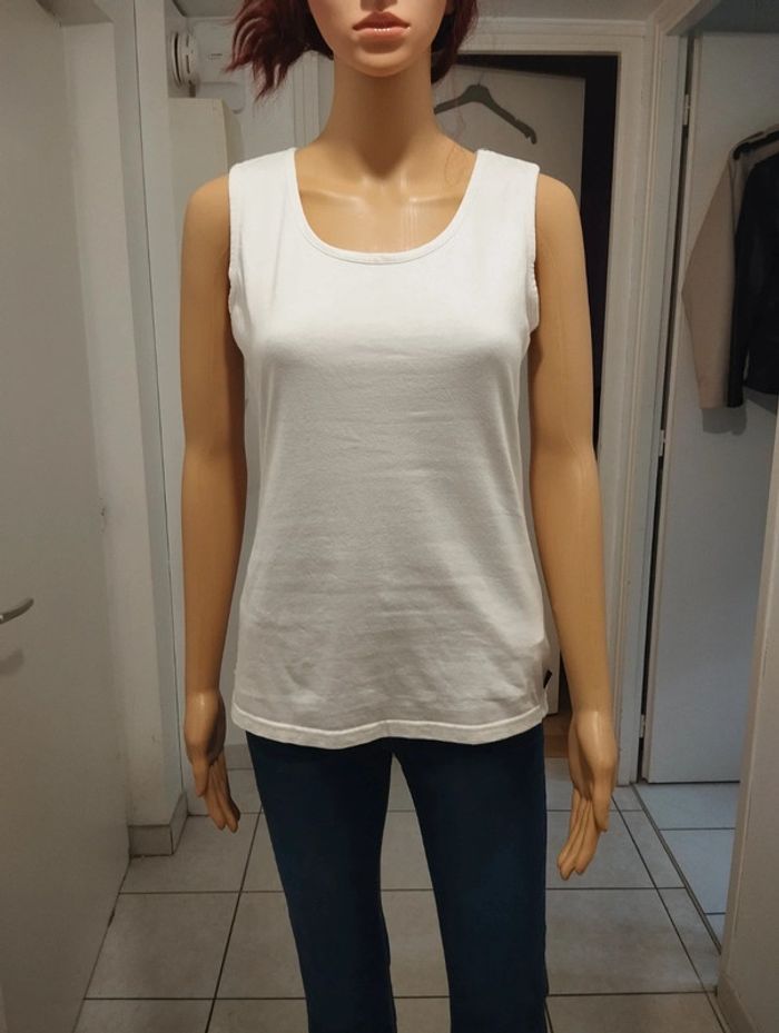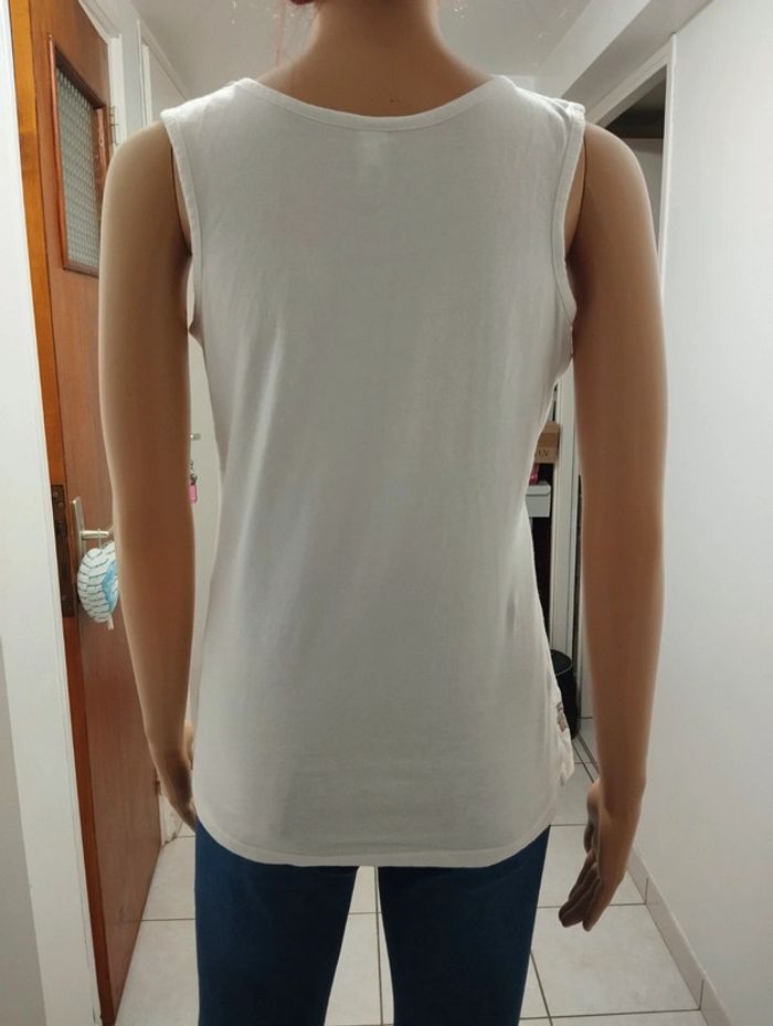 ℹ️ Débardeur de douleur blanche unie. Il y a une fleur brodée sur le bas d'un côté. Tissu léger, agréable à porter et pas transparent. 🧵 100% coton bio 📏 Aisselle à aisselle: 45cm Largeur taille: 40cm Longueur totale: 61cm T1