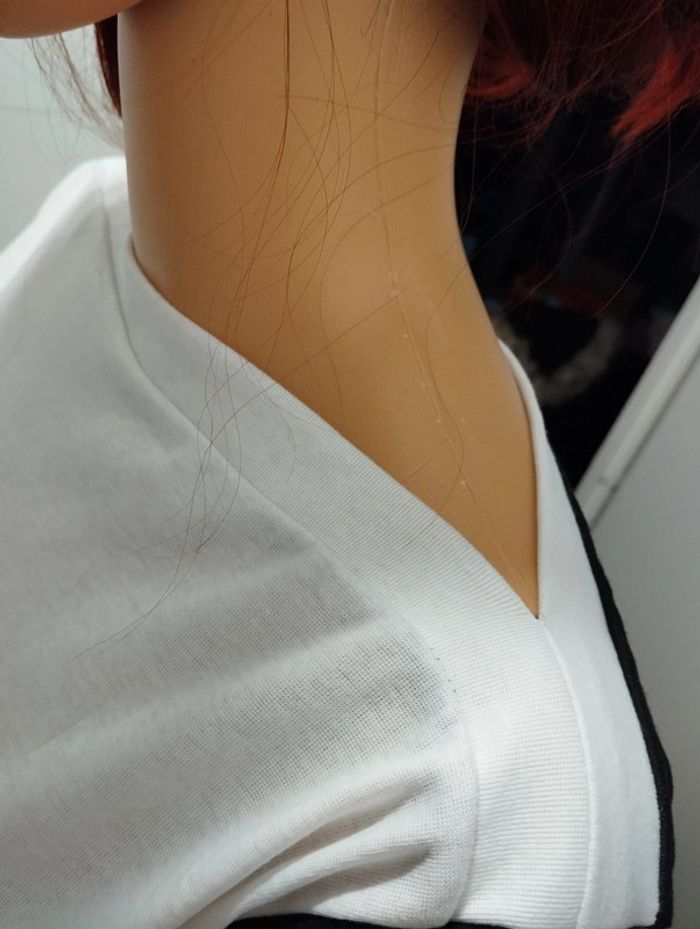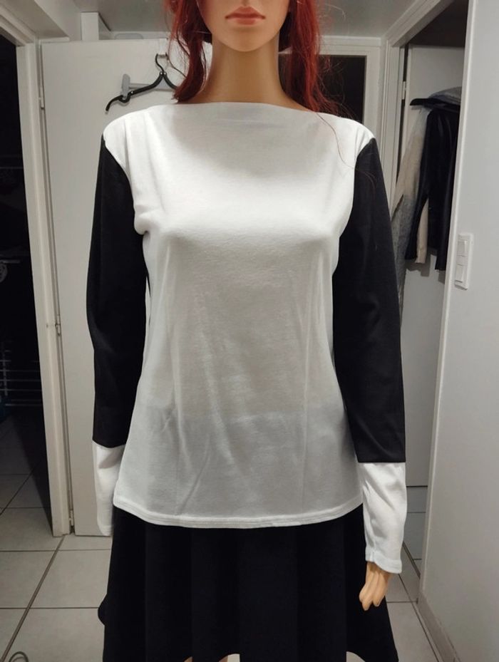 ℹ️ Pull léger de couleur blanche devant et noire derrière. Le tissu est plutôt léger, extensible et agréable à porter. Le col est droit. 🧵 Pas d'étiquette de composition. 📏 Largeur épaules: 41cm Aisselle à aisselle: 48cm Largeur taille: 45cm Longueur totale: 62cm B