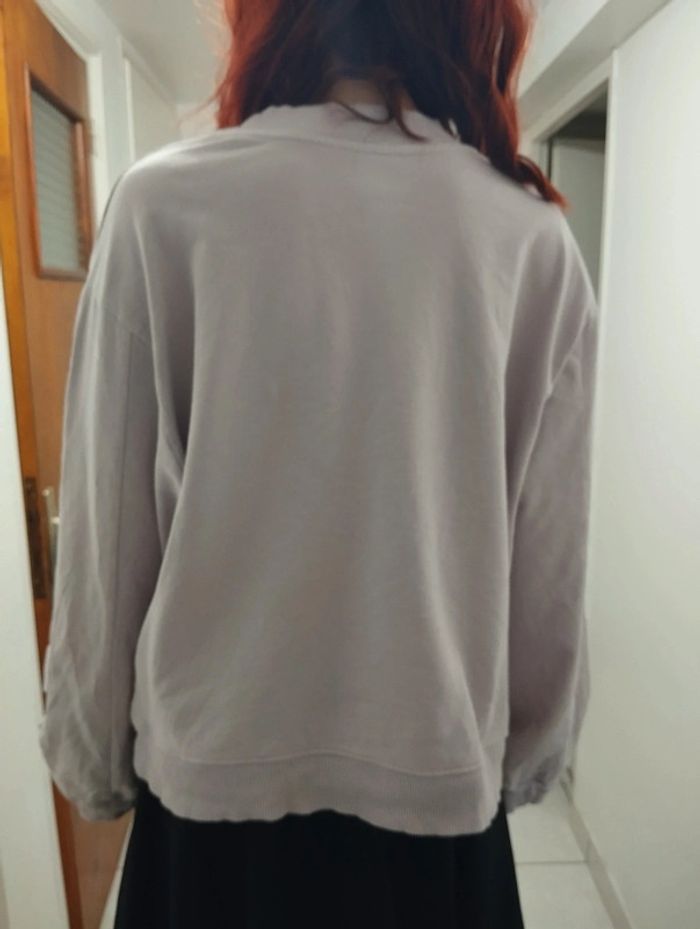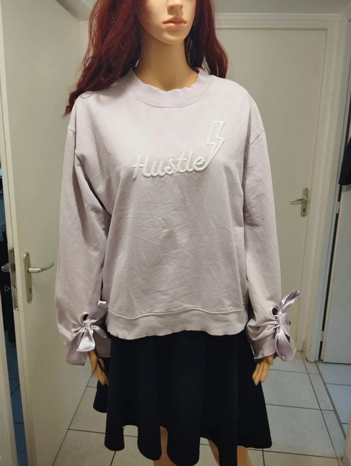 ℹ️ Pull de couleur parme. Inscription sur le devant en blanc. Les manches se finissent par un noeud comme du satin. Tissu plutôt léger. N'ayant plus d'étiquette de taille, N'hésitez pas à vérifier les dimensions. 🧵 Pas d'étiquettes de composition. 📏 Largeur épaules: 52cm Aisselle à aisselle: 61cm Largeur taille: 56cm Longueur totale: 59cm C2