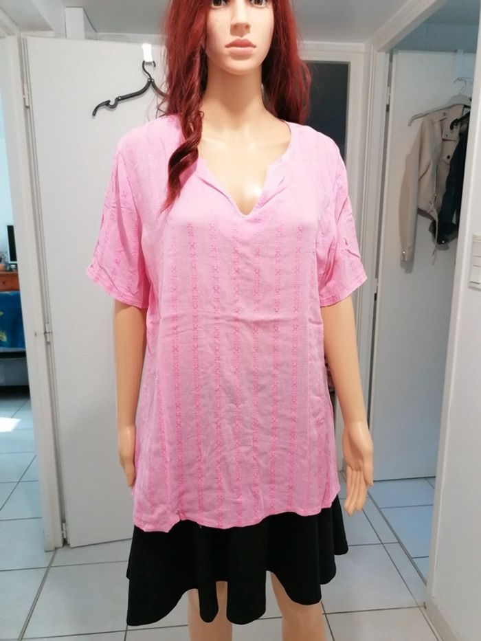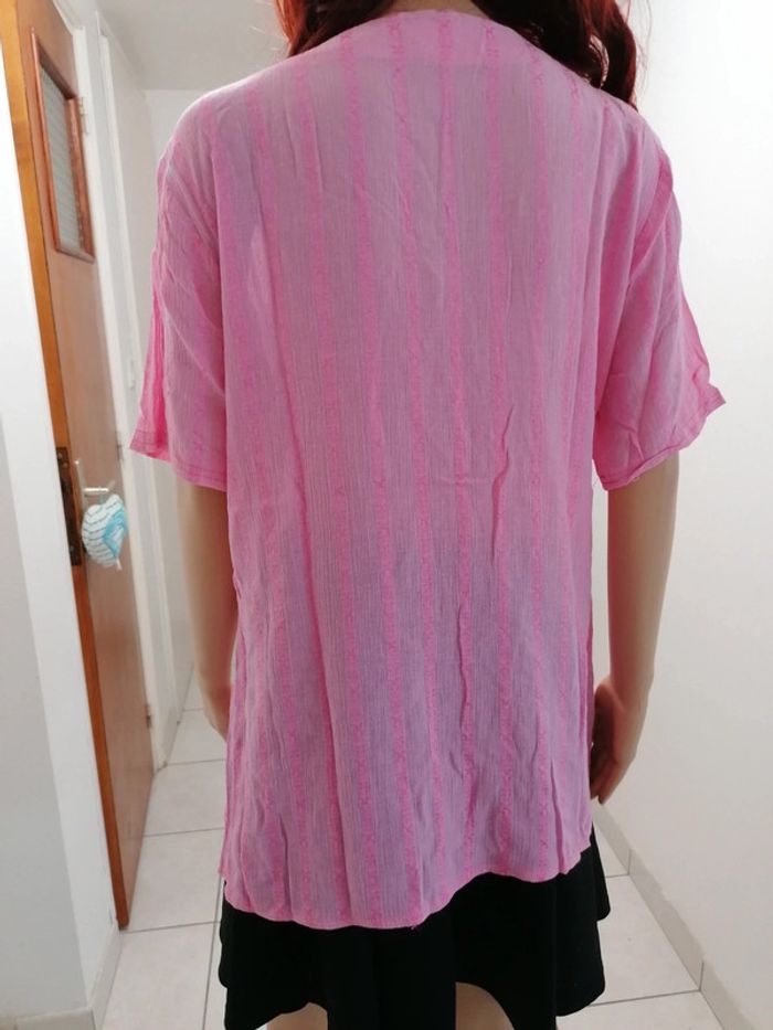 ℹ️ Tee-shirt rose avec bandes verticales brodées. Le tissu est légèrement transparent. Matière légère et agréable à porter. Tissu un peu extensible. 🧵 Pas d'étiquette de composition. 📏 Largeur épaules: 45cm Aisselle à aisselle: 60cm Largeur taille: 54cm Longueur totale: 73cm C2