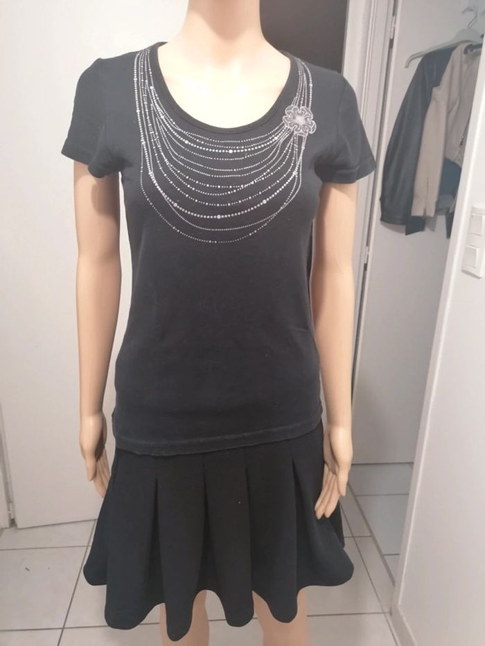 ℹ️ Tee-shirt noir avec déco comme un collier avec quelques paillettes. Tissu extensible et plutôt épais. Taille 36/38. 🧵 Pas d'étiquette de composition. 📏 Largeur épaules: 35cm Aisselle à aisselle: 41cm Largeur taille: 37cm Longueur: 60cm R1
