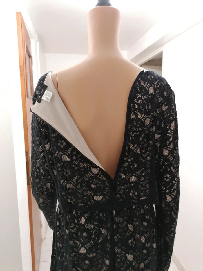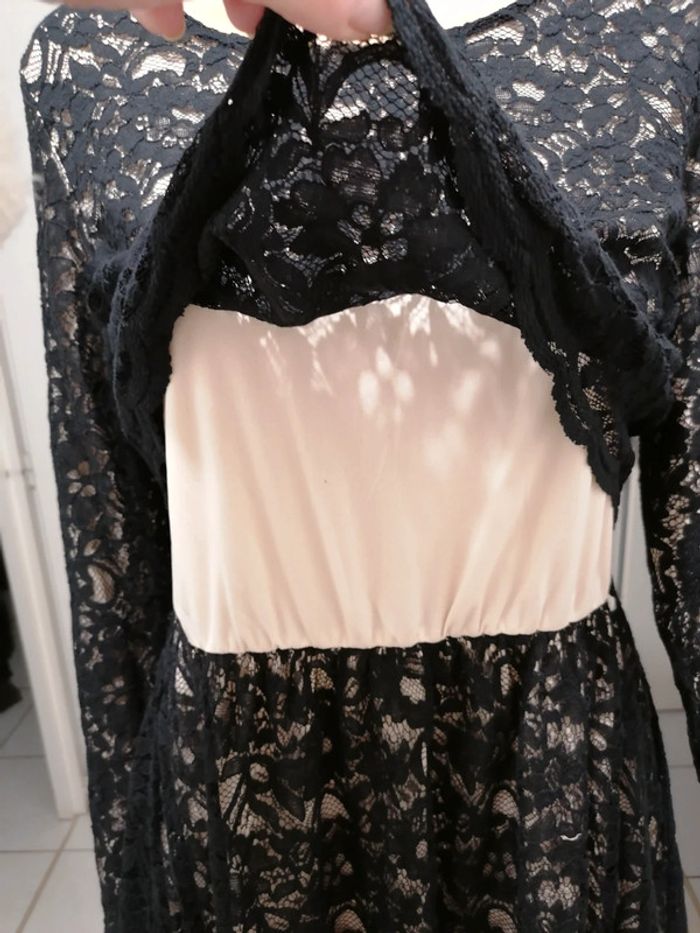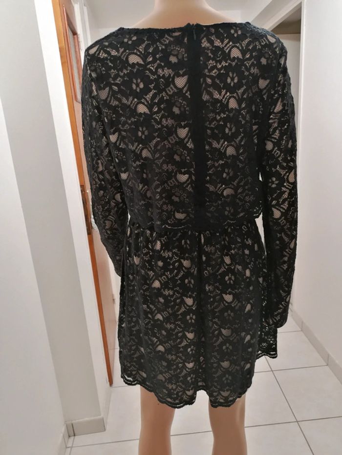 ℹ️ Très jolie robe en dentelle noire avec une doublure crème. La taille est élastique. Il y a une fermeture éclair dans le dos. 🧵 Dentelle : 60% coton 40% polyamide Doublure : 100% polyester 📏 Largeur épaules: 40cm Aisselle à aisselle: 51cm Largeur taille: 43cm Longueur: 88cm Z
