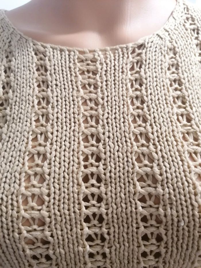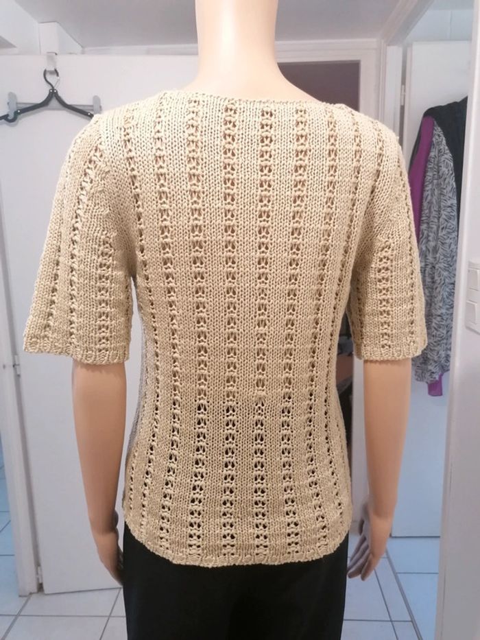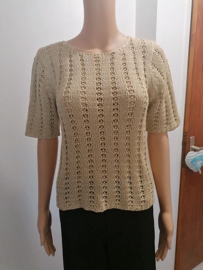 ℹ️ Tee-shirt en maille de couleur beige / ocre. Taille 42/44. Légèrement extensible. 🧵 100% acrylique 📏 Largeur épaules: 36cm Aisselle à aisselle: 46cm Largeur taille: 46cm Longueur: 56cm Z