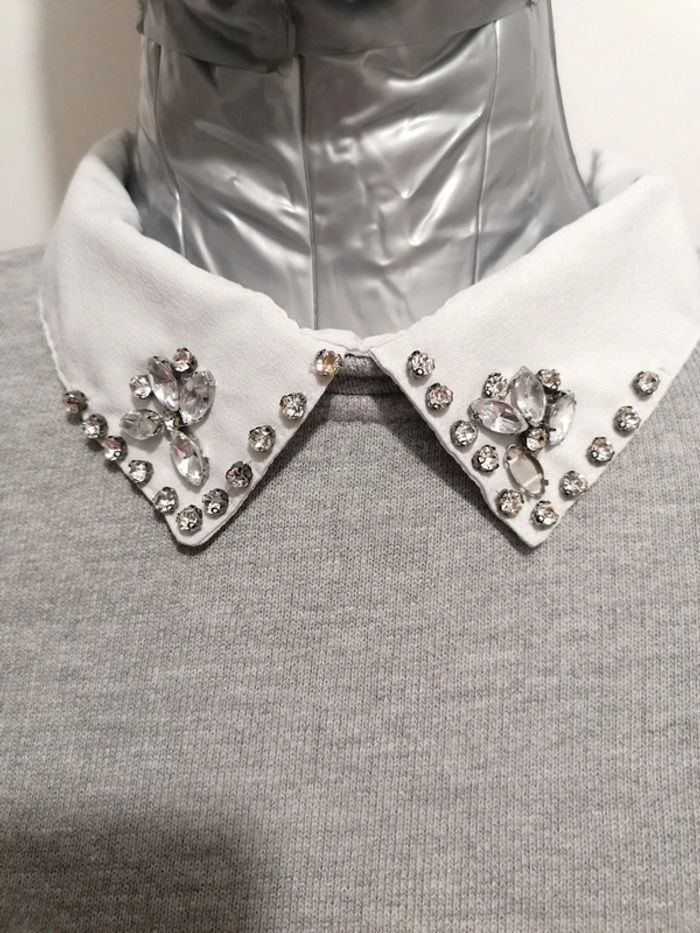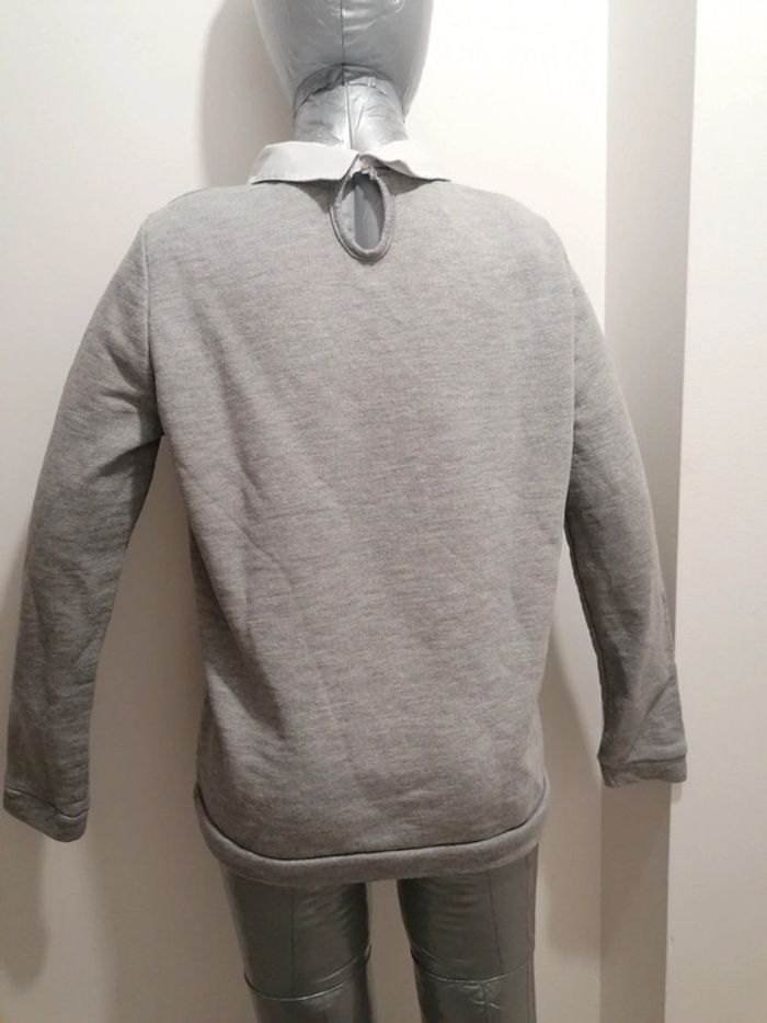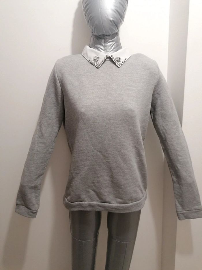 Pull gris avec un col blanc. Il y a des perles cousues sur le col. Il en manque une. Le col se ferme grâce à un bouton dans le cou. Tissu plutôt épais et chaud. N