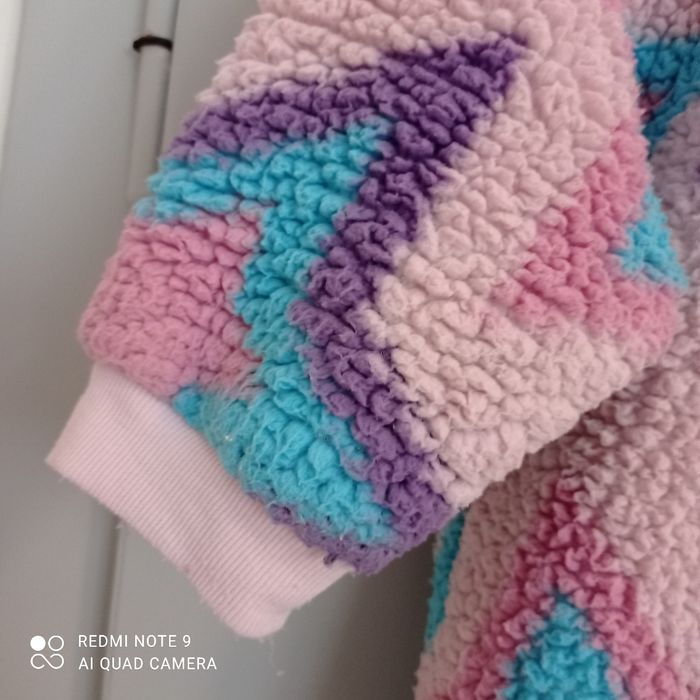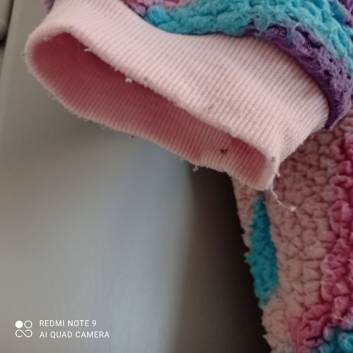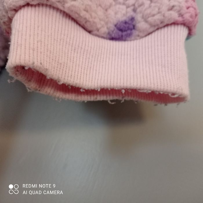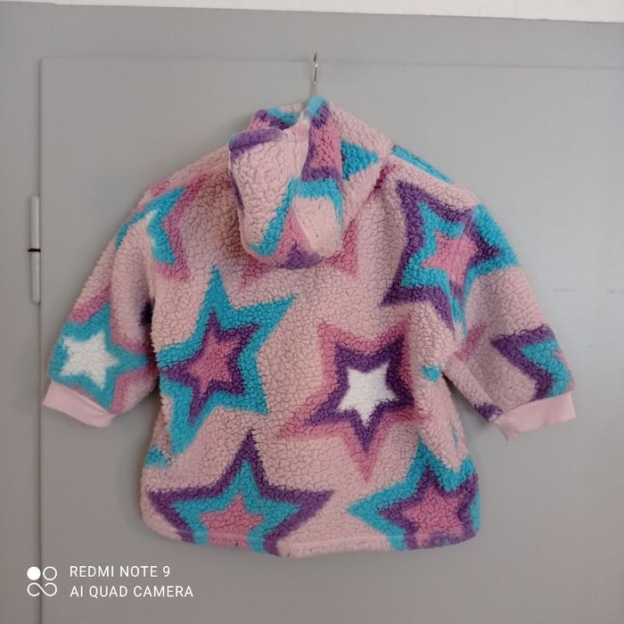 Sweat polaire à capuche. Tout doux. Bien chaud. Bouloché. Jolies couleurs girly et joli motif étoiles. Traces d usure aux manches et en bas voir photos.