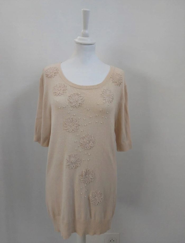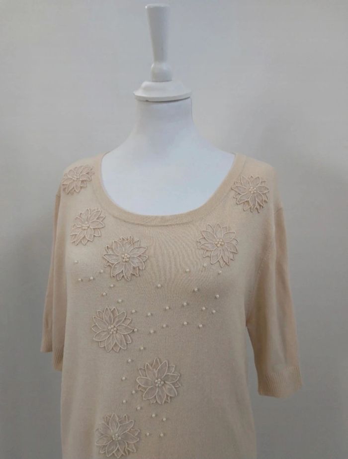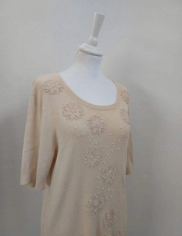 Pull long avec broderies fleurs et perles manches courtes crème femme M 38 - photo numéro 3