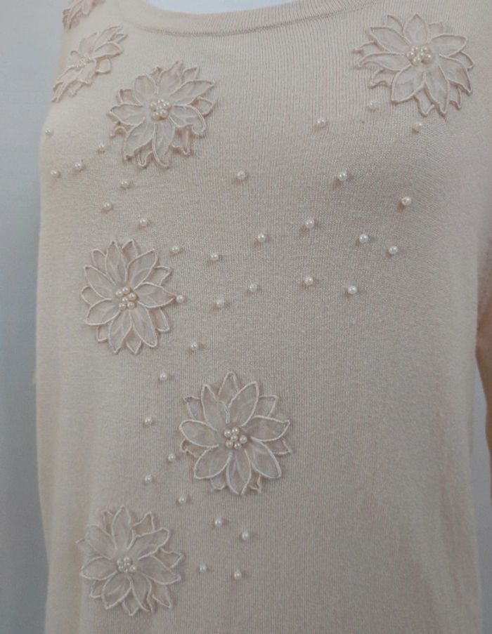 Pull long avec broderies fleurs et perles manches courtes crème femme M 38 - photo numéro 7