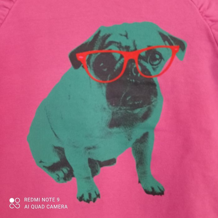 Coton et polyester. Quelques taches à l arrière d une manche voir photos. Bulldog vert à lunettes rouges.