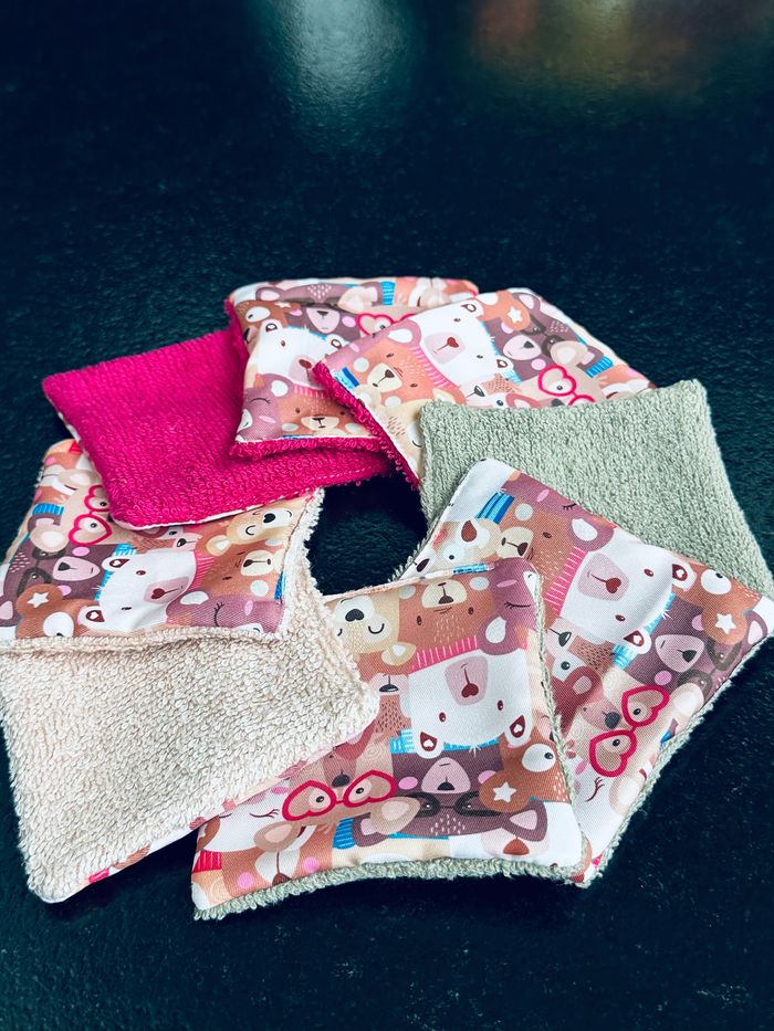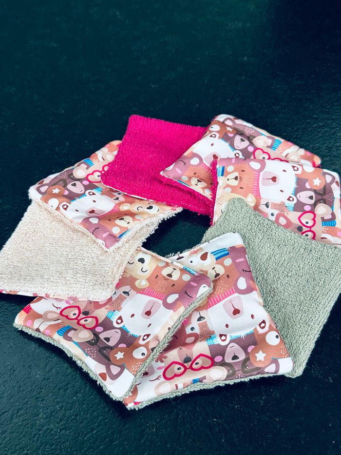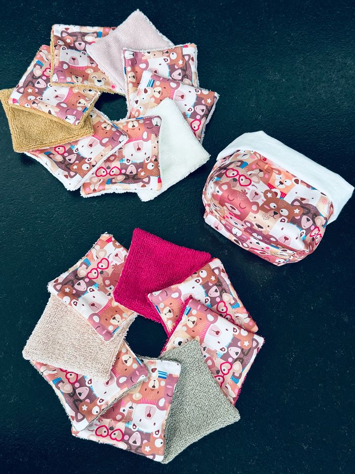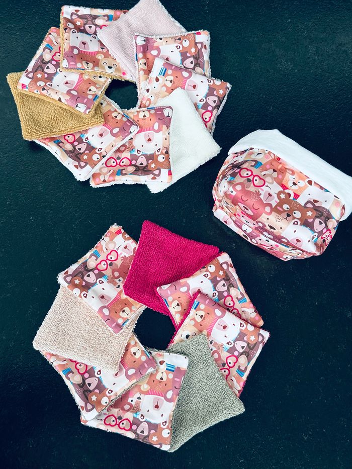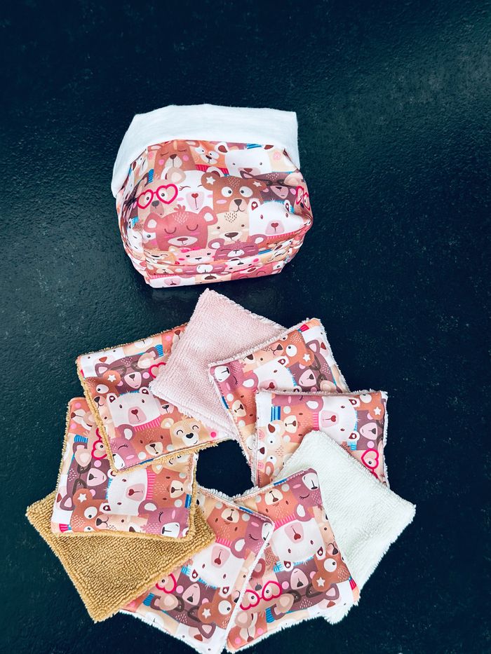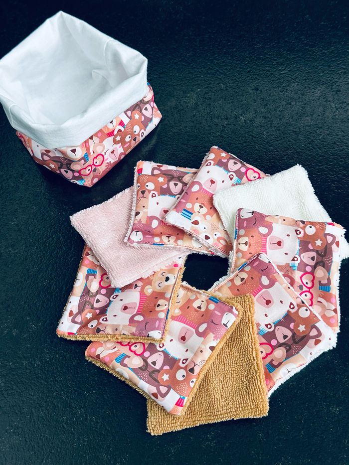 Lot de 18 lingettes : 9 lingettes en éponge coton et 9 lingettes en éponge bambou avec panier assorti. Possibilité de vendre séparément
