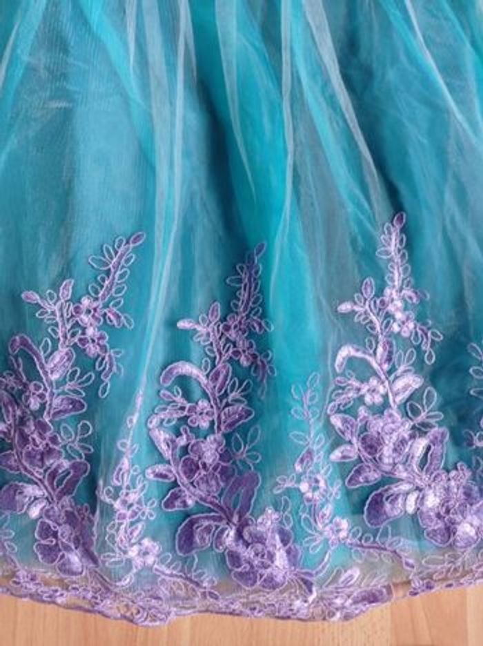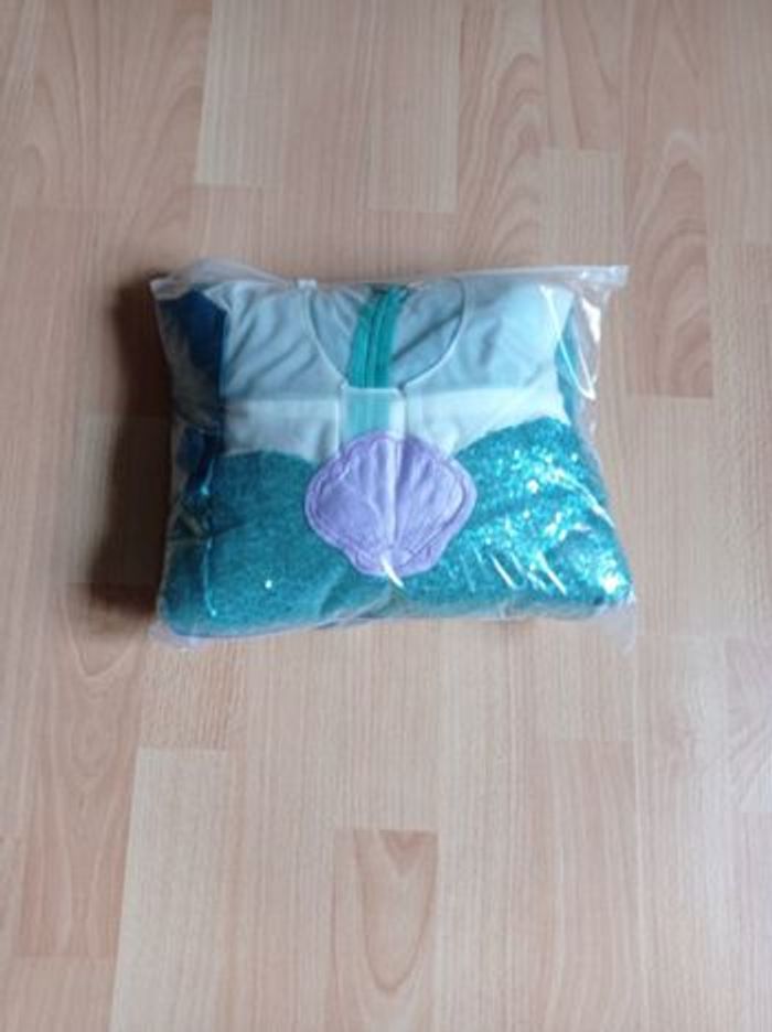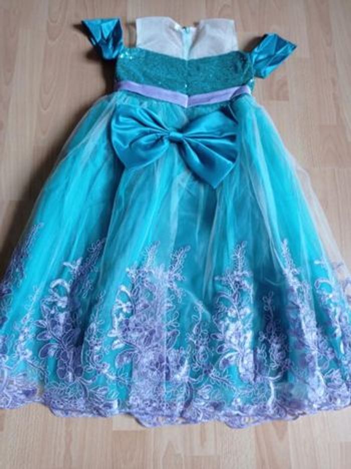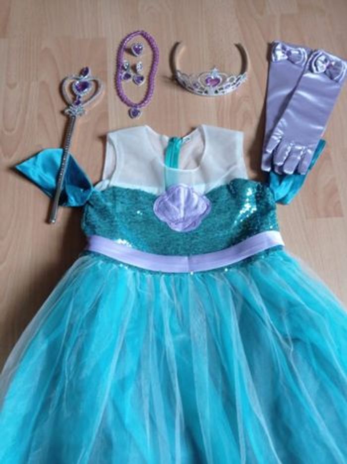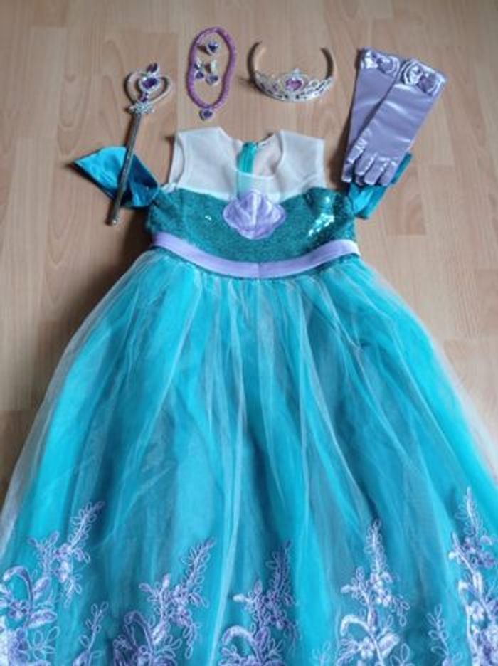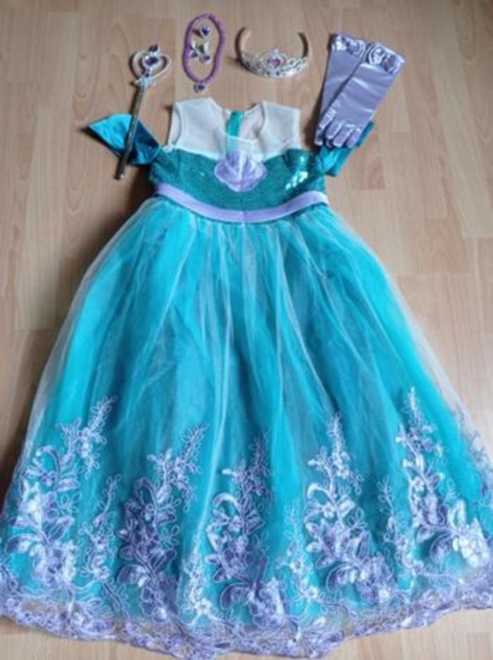 Déguisement robe princesse sirène turquoise et violette et ces accessoires (couronne, baguette, gants, noeud). La robe mesure 80cm, la taille convient aux petites filles de 4-5ans. Totalement neuve, vendue dans son emballage d’origine. Expédition rapide après votre commande