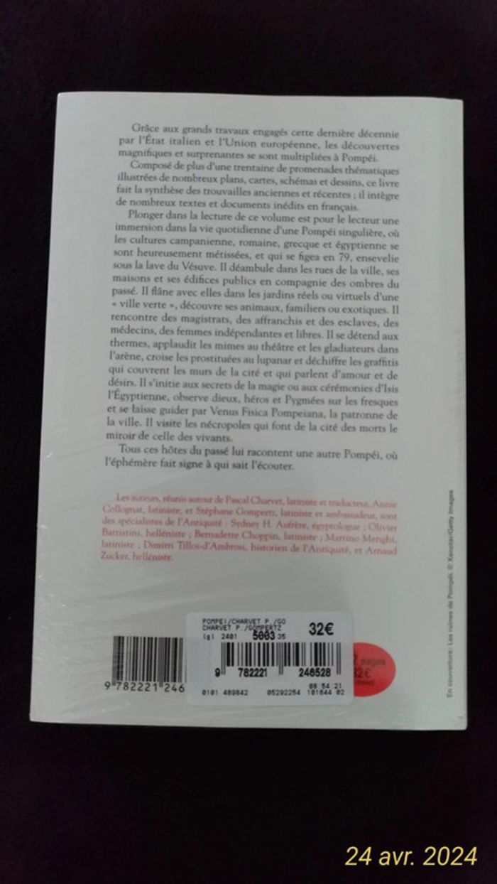 Un livre destiné aux visiteurs comme aux lecteurs qui veulent découvrir les trésors de Pompéi et comprendre sa singularité : campanienne, romaine et ouverte sur l'Orient. Abondamment illustré, pourvu de multiples plans, organisé autour de 37 promenades et d'un dictionnaire de vies des Pompéiens. Parutiin en 2023. 1024 pages. Livre neuf, encore sous emballage.